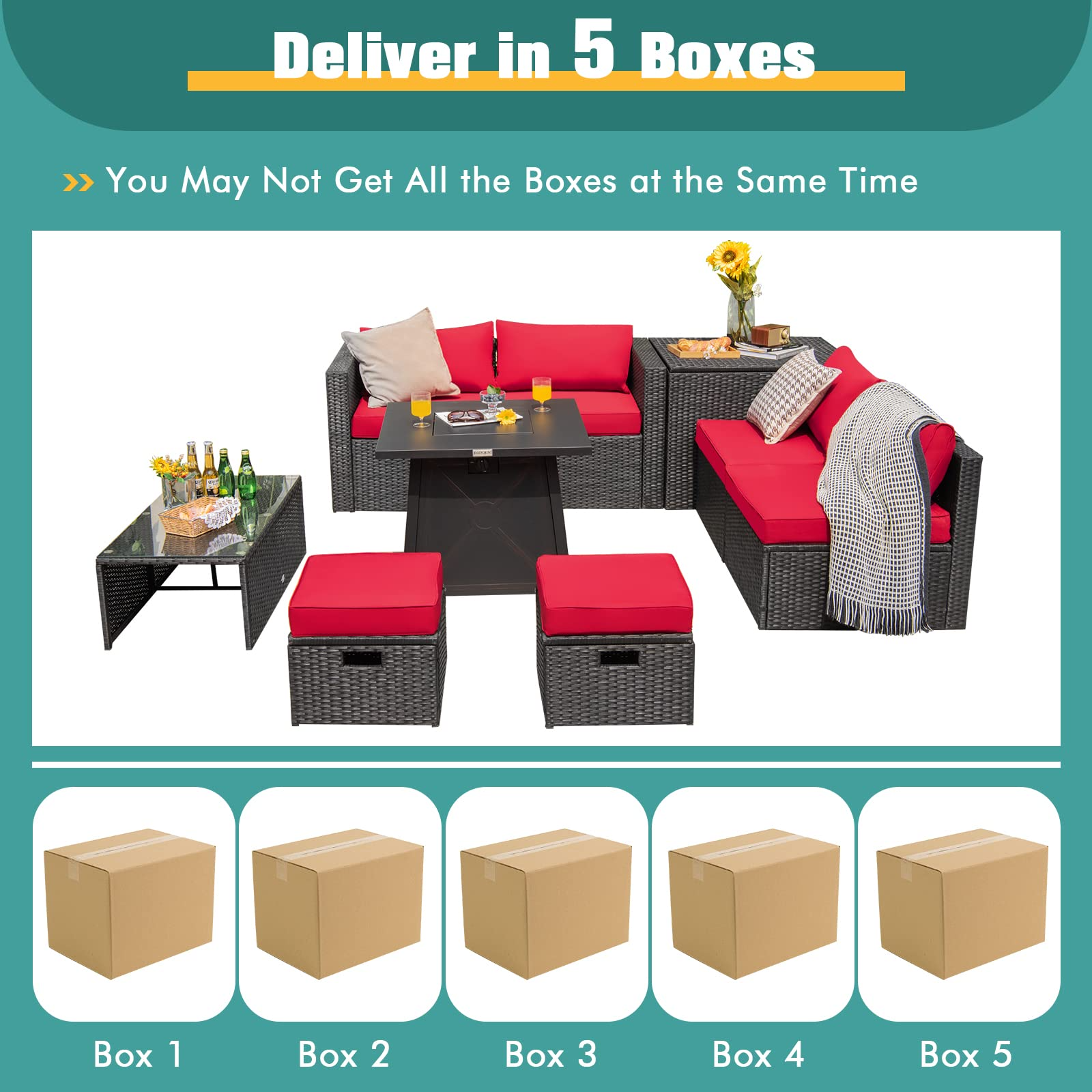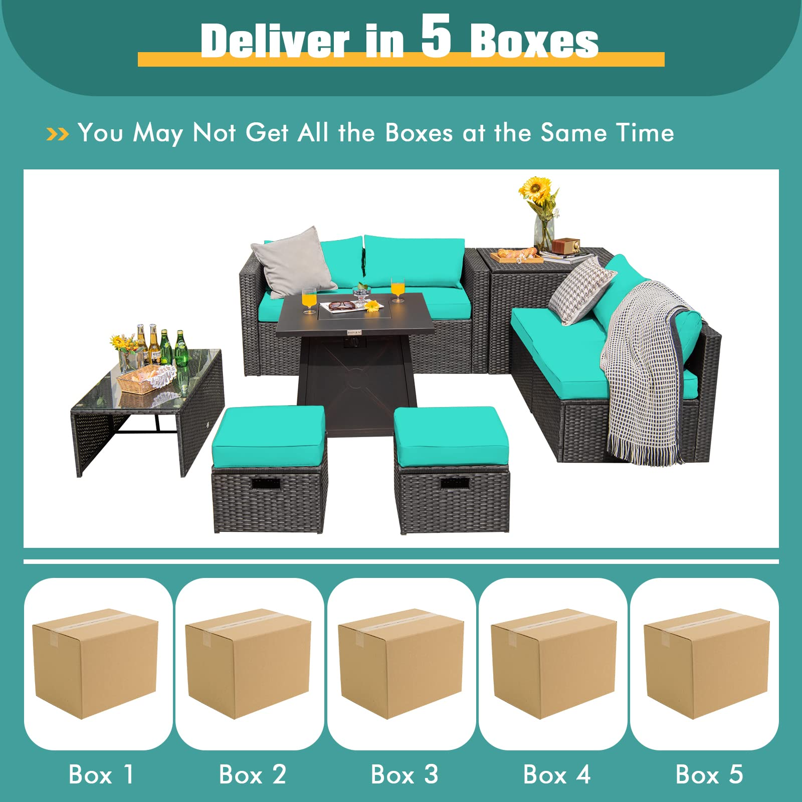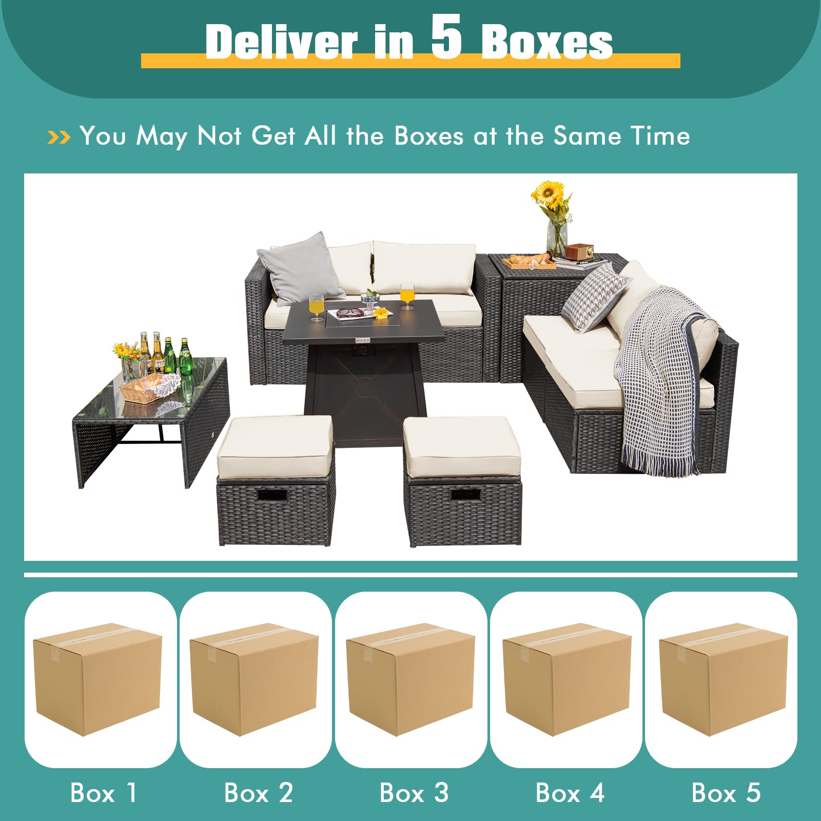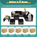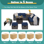 - 5-Package Delivery: This 9-piece patio set will be delivered in 5 packages so the arrival time may vary. The installing accessories for the coffee table, ottoman, storage box, and sofas are in box 1 of the sofa set, and another screw bag will be shipped with the fire pit table. Dimension: firepit table: 30"x 30"x 25"(L x W x H), coffee table: 39.5"x 20"x 13.5"(L x W x H), storage box: 33.5"x 29.5"x 26"(L x W x H), ottoman: 17.5"x 17.5"x 16"(L x W x H), corner Sofa: 29.5"x 29.5"x 25.5"(L x W x H), armless sofa: 28"x 27"x 25"(L x W x H).