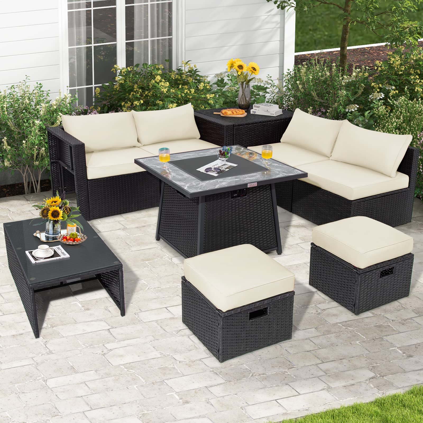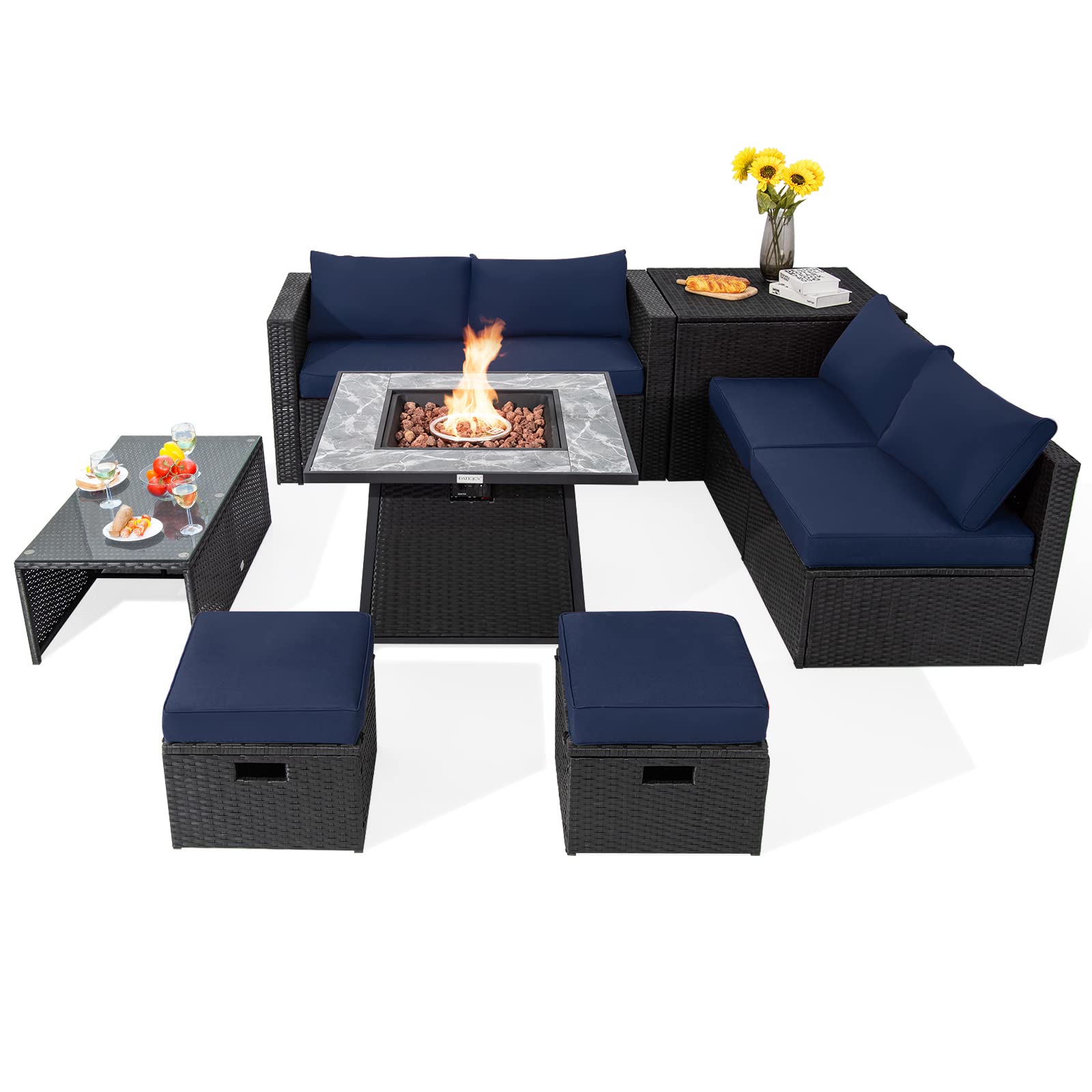 - About Delivery: This 9-piece patio sectional sofa with fire pit table set will be shipped in 5 boxes (1 box for the fire pit table and 4 boxes for the patio PE rattan sofa set) that may not arrive on the same day. There are 2 bags of screws: 1 bag in the box of the fire pit table and another bag in the first box of the patio PE rattan sofa set.