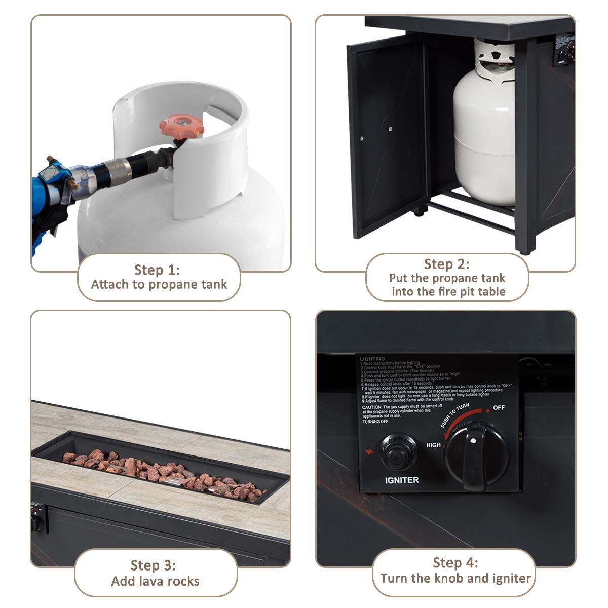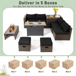 In the cold winter, the 60,000 BTU fire pit table delivers steady and efficient warmth to you, making the outdoor gathering never ends. And the soft padded cushions can't wait to provide you with a comfortable experience. When it comes to summer, just cover the lid on the fire pit table, using it as an additional coffee table. Therefore, you will get more space to put delicious food. No matter which season you use this outdoor conversation set, the sun-protective PE wicker, rustproof steel frame and fade-resistant ceramic will always show you its higher durability and stronger stability in the outdoor environment. When the party is over, just put the coffee table, storage box, 2 ottomans, 2 corner sofas and 2 armless sofas into a compact size for better storage. After that, you can cover the waterproof covers on the patio sofa set and fire pit table respectively for better protection.