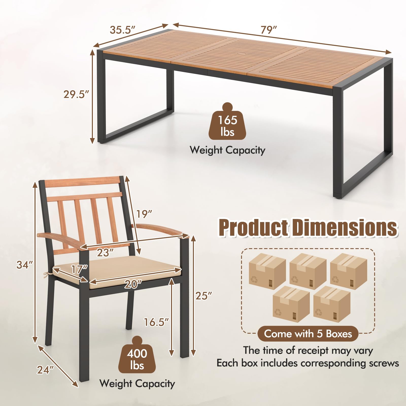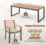 Expertly crafted from high-quality acacia wood and a sturdy metal frame, our outdoor dining set offers not only durability but also an elegant enhancement to any space. The soft cushions offer sublime seating comfort while the 1.9” umbrella hole in our spaciously designed table ensures you enjoy your gatherings shaded from the sun. The space-saving design allows for compact storage, making this outdoor table and chairs set an ideal choice for gardens, decks and backyards.