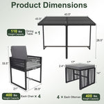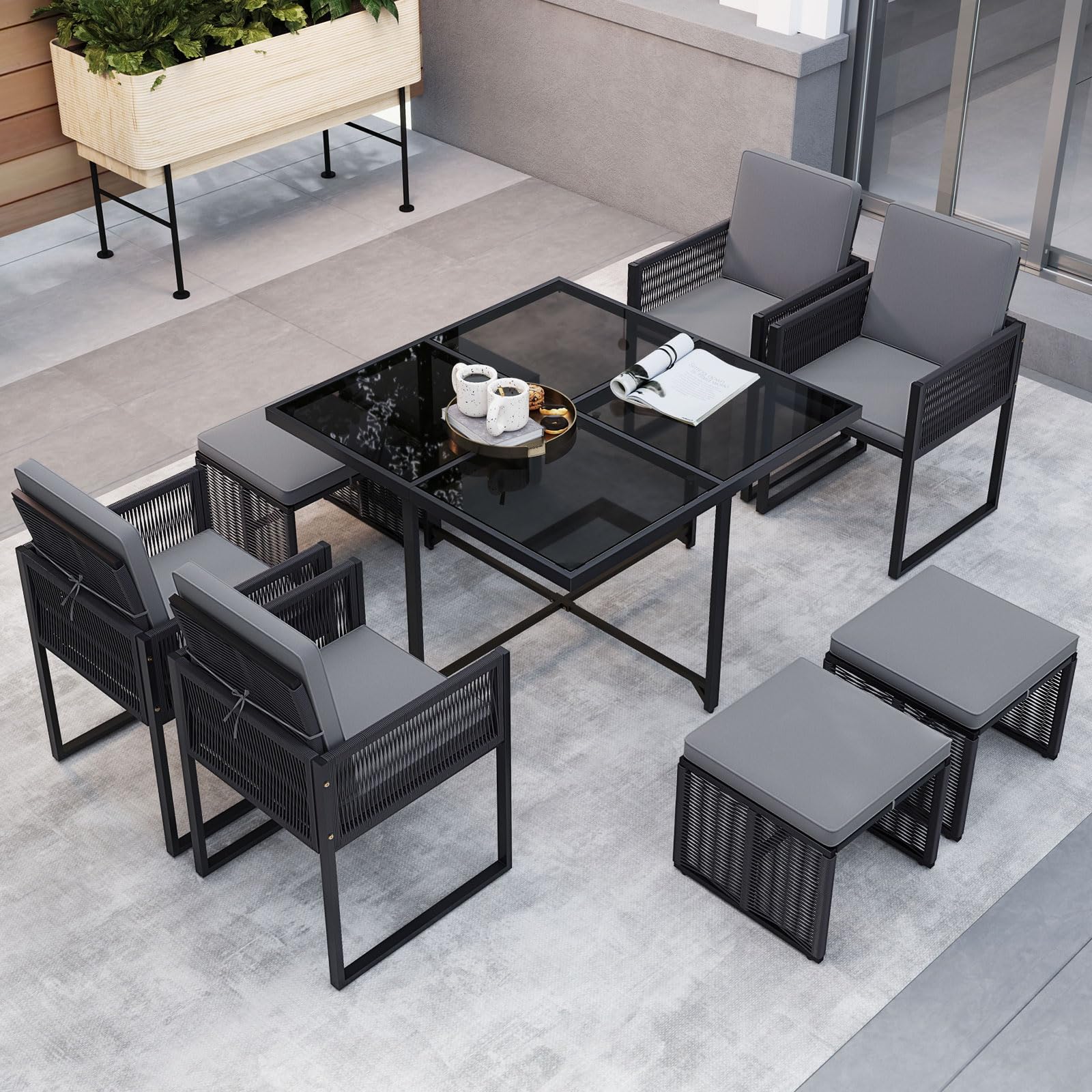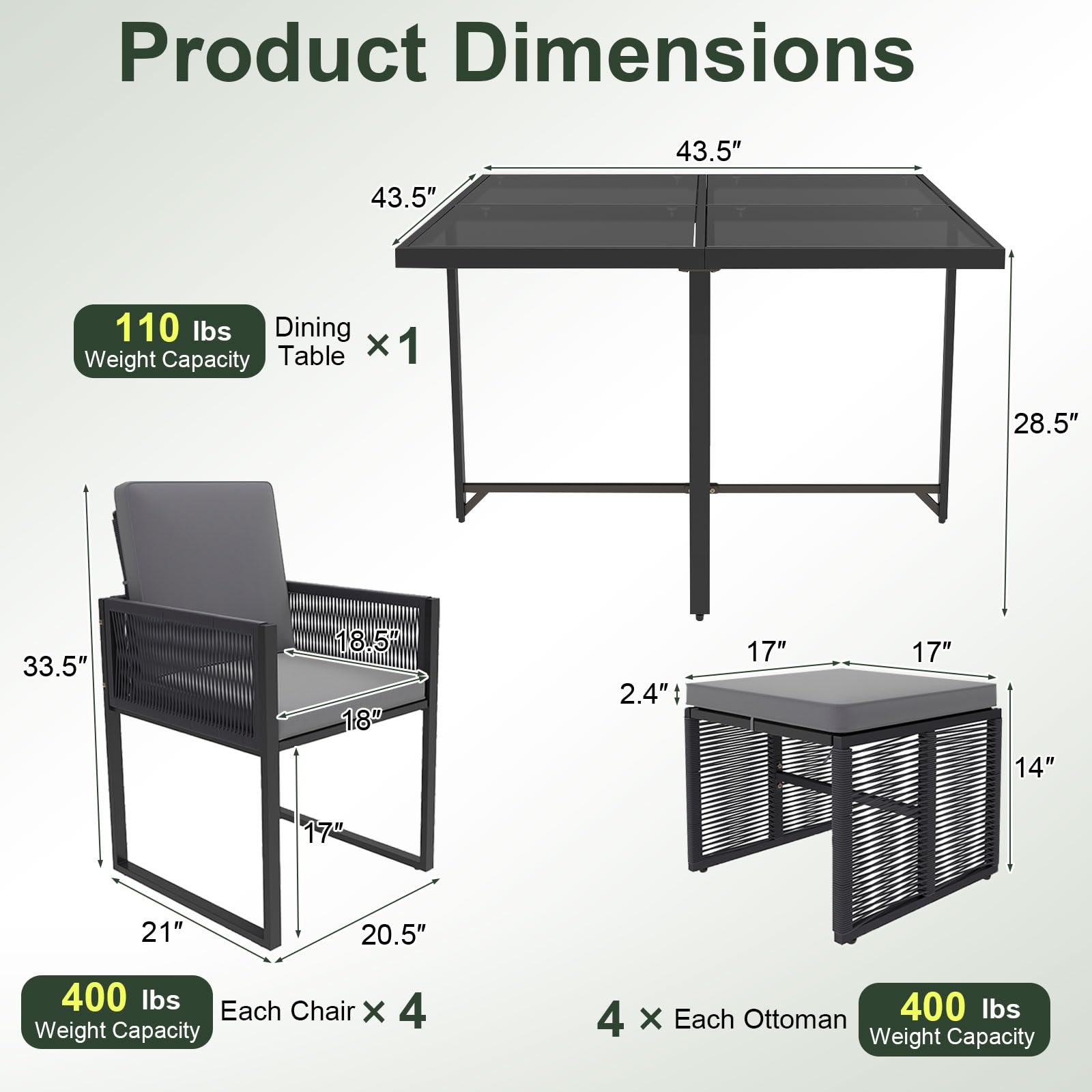 This patio table and chairs set is made of sturdy metal frame and sun-protective PE rattan, which ensures not only strong loading capacity but also long-lasting performance. Additionally, the high-quality tempered glass tabletop is secured by 16 suction cups for enhanced safety. These patio chairs and ottomans are designed with soft cushions for ultimate comfort, which also feature removable cushion covers for hassle-free cleaning. With the space-saving design, you can easily tuck ottomans under chairs and store the whole set neatly beneath the square dining table.