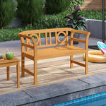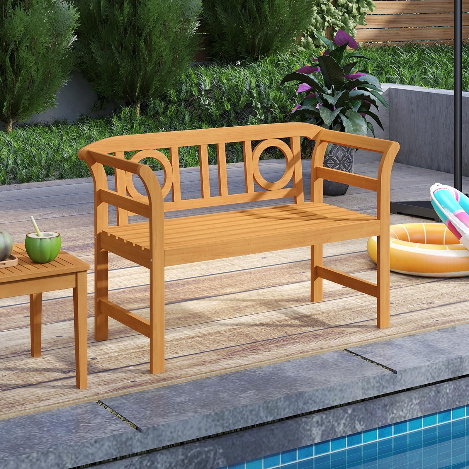 Enhance your outdoor living space with the acacia wood bench. Crafted from high-quality, solid acacia wood, it combines durability with a natural aesthetic that stands up to the elements year after year. Furthermore, it also offers maximum comfort with its ergonomic design, featuring a practical circle patterned backrest, dual armrests, and a spacious seat. Perfect for seating 2, this robust bench supports up to 800 lbs, making it a reliable and safe choice. Customize it to suit your style or match your existing outdoor decoration with ease; the natural wood finish can be painted to create a look that's uniquely yours.