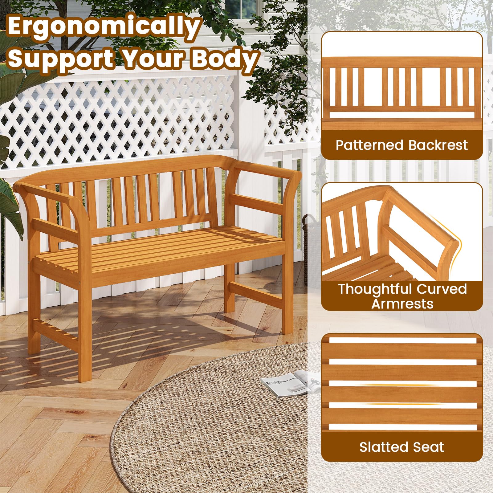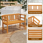 Enhance your outdoor living space with the acacia wood bench. Crafted from high-quality, solid acacia wood, it combines durability with a natural aesthetic that stands up to the elements year after year. Furthermore, it also offers maximum comfort with its ergonomic design, featuring a practical slatted backrest, dual armrests, and a spacious seat. Perfect for seating 2, this robust bench supports up to 800 lbs, making it a reliable and safe choice. Customize it to suit your style or match your existing outdoor decoration with ease; the natural wood finish can be painted to create a look that's uniquely yours.