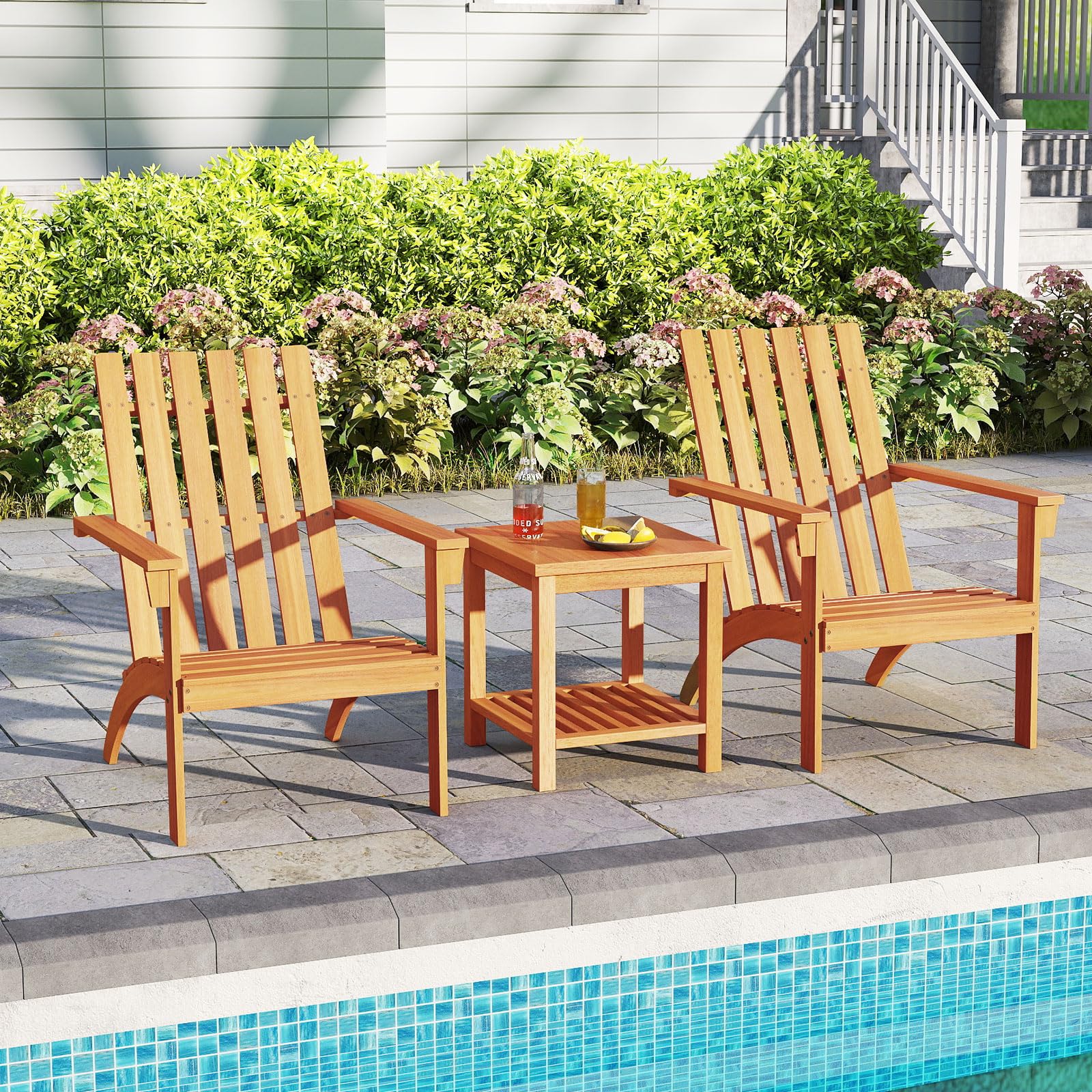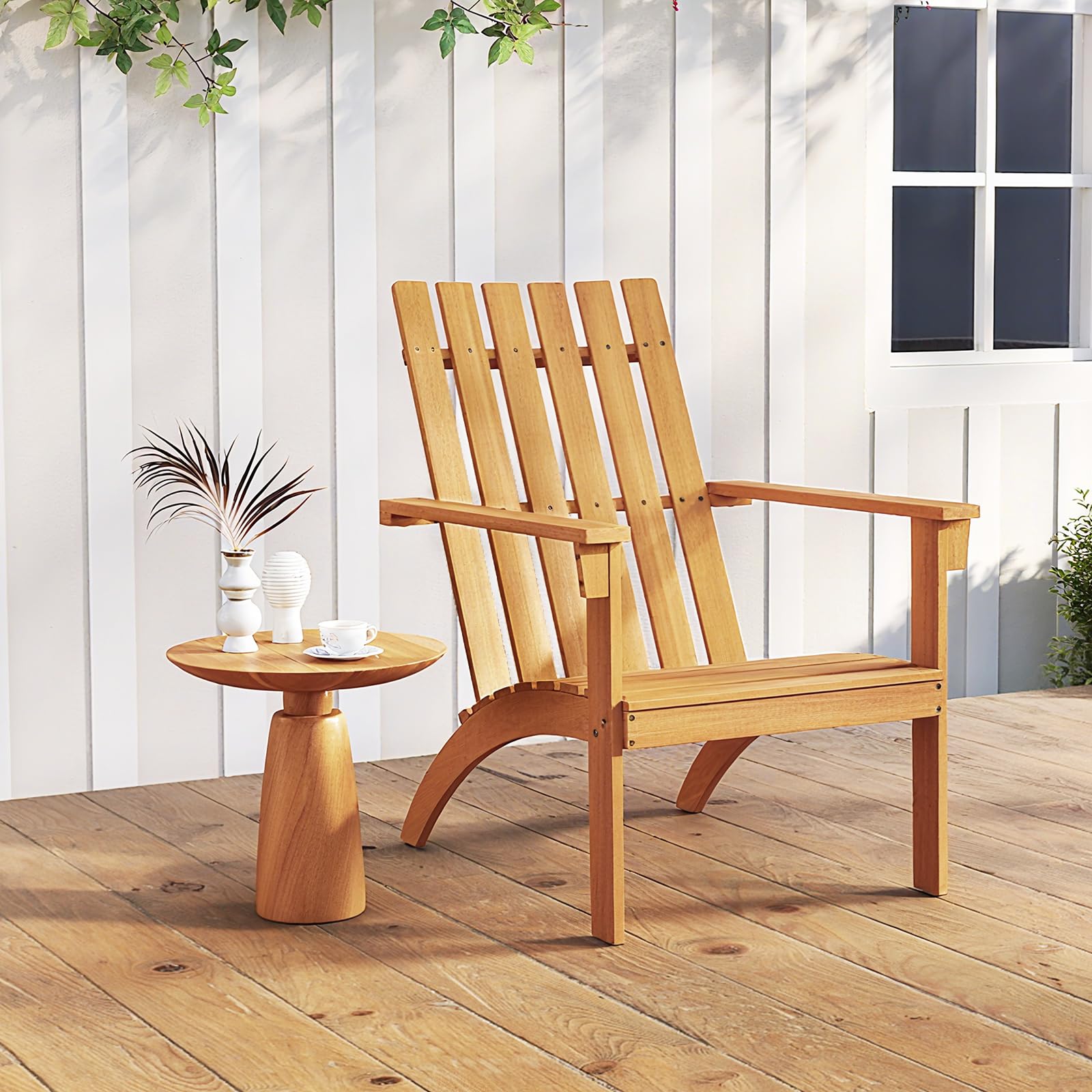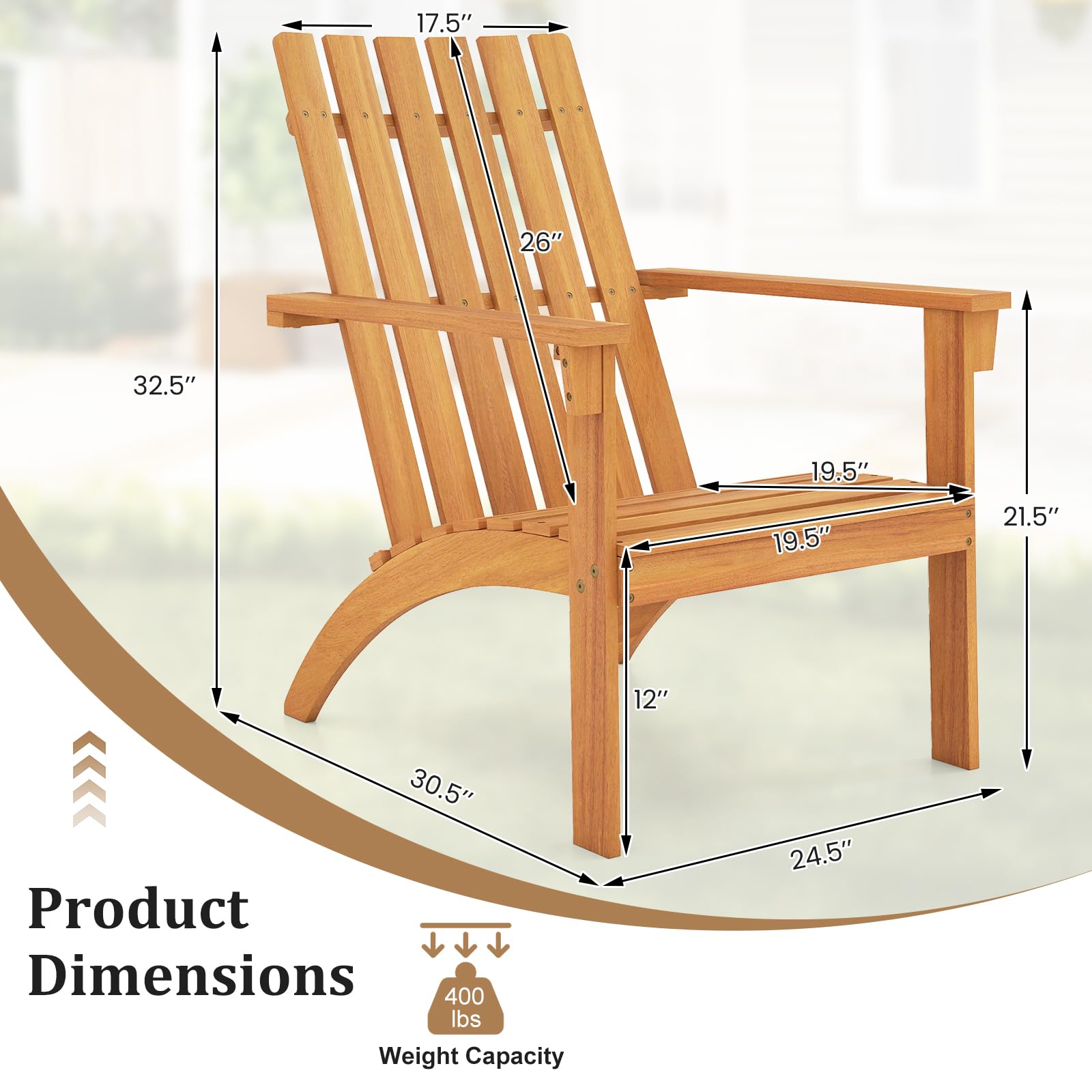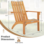 Experience outdoor comfort with our Adirondack chair. This Adirondack chair is a solid acacia wood creation that is not only built to last but also inviting with wooden texture. This chair, with its inclined backrest and curved seat, offers ergonomic support for relaxation, while the wide armrests provide added ease. Additionally, its robust construction, complete with reinforced back support and sturdy legs, can handle up to 400 lbs, ensuring a reliable addition to a variety of outdoor spaces. Plus, the smooth surface is effortless to clean, making maintenance a breeze. Whether by the fire pit, on the porch or in the garden, this Adirondack chair is versatile enough to fit various setting, enhancing your outdoor living experience with its classic design.