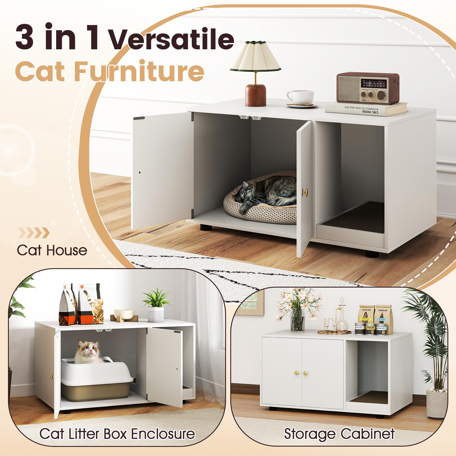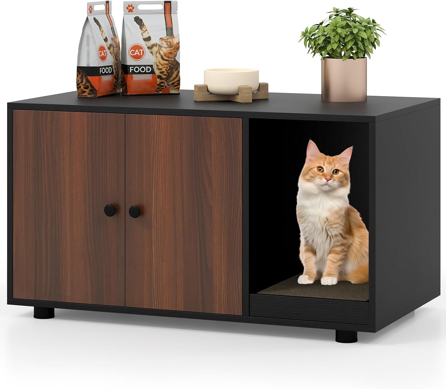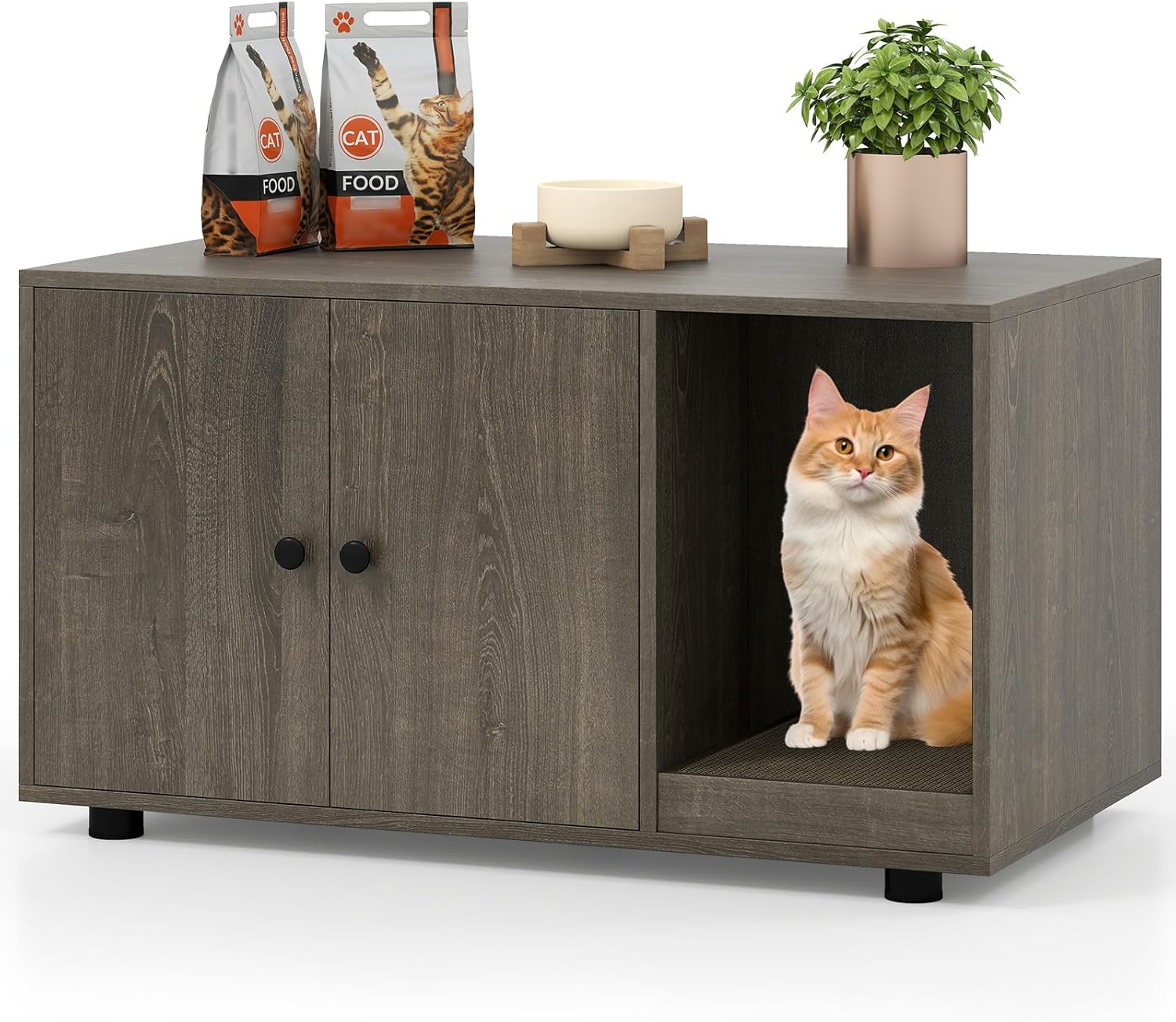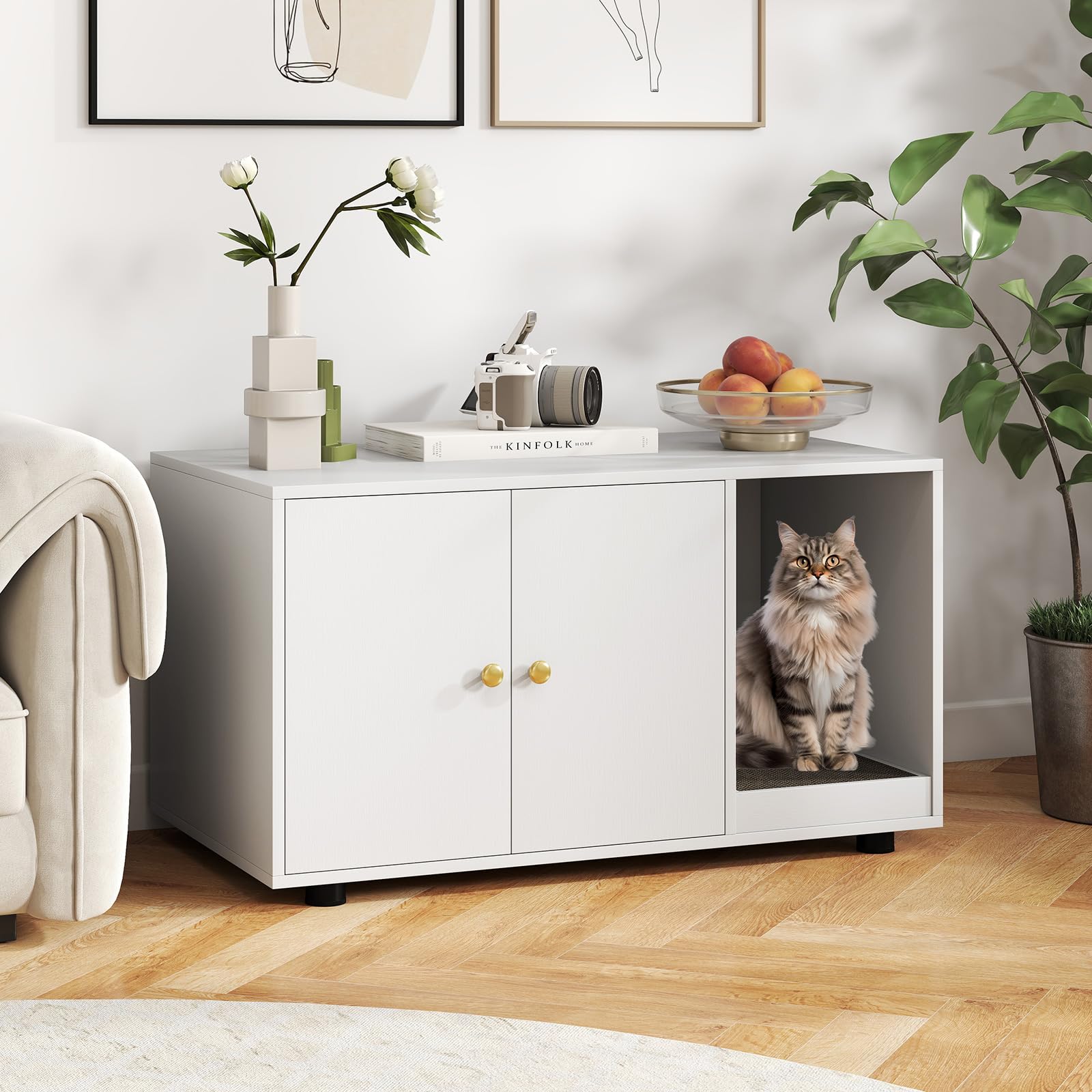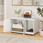 Transform your home with a multifunctional cat litter box enclosure furniture piece that combines style, privacy, and convenience in one elegant solution. This modern cat cabinet effectively reduces unpleasant smells, reduces litter tracking while offering private space where your pet can relax away from prying eyes, while its large size fits most standard litter boxes. Featuring a side-mounted scratching board, the cat litter box enclosure encourages natural play and reduces scattered litter, complemented by a unique winding entry that's easy for your feline to navigate. With adjustable foot pads to ensure stability, this unit protects your floors and can support up to 88 lbs. The large double-door cabinet with a smooth easy-to-clean surface makes maintenance a breeze, and its straightforward assembly suits the needs of busy pet owners.