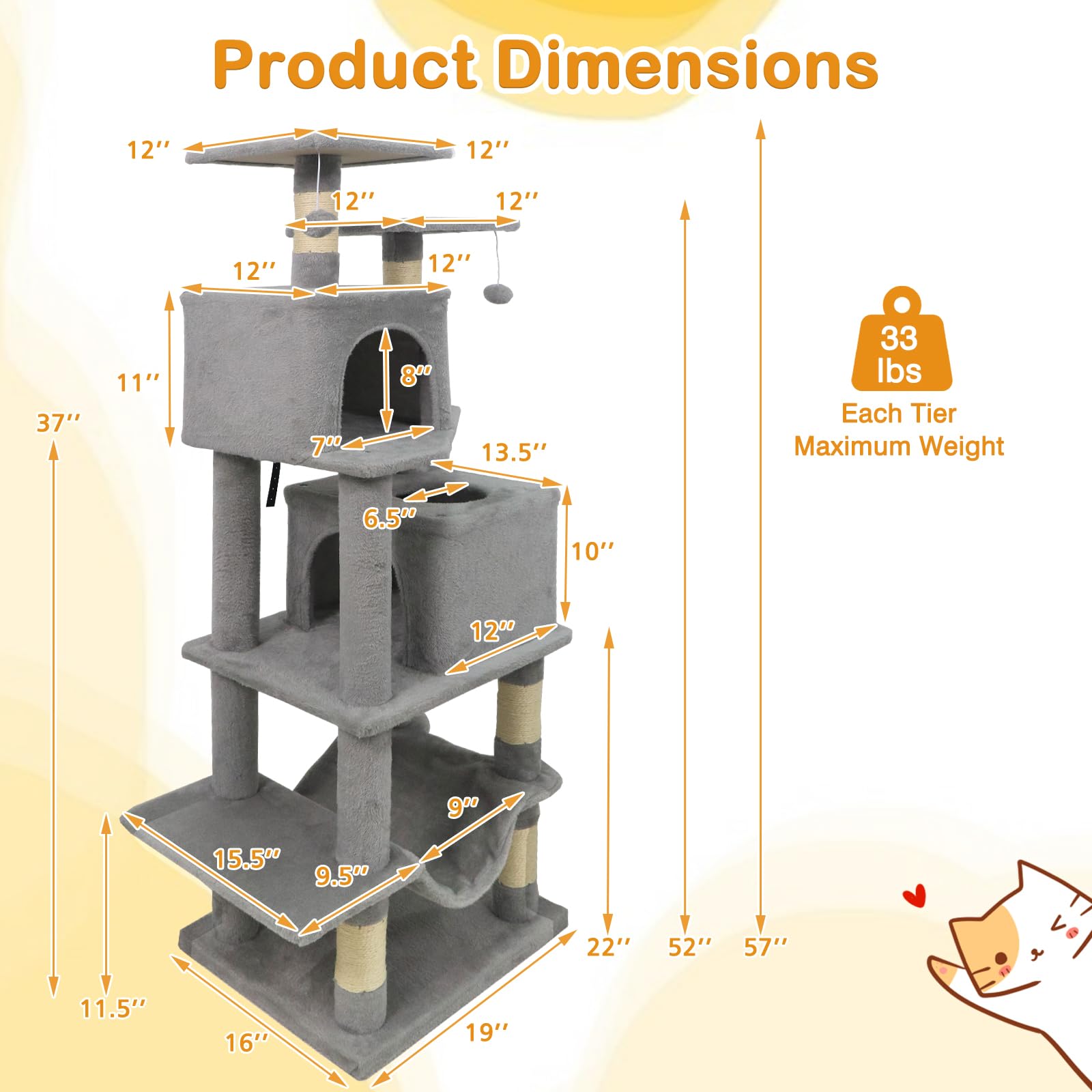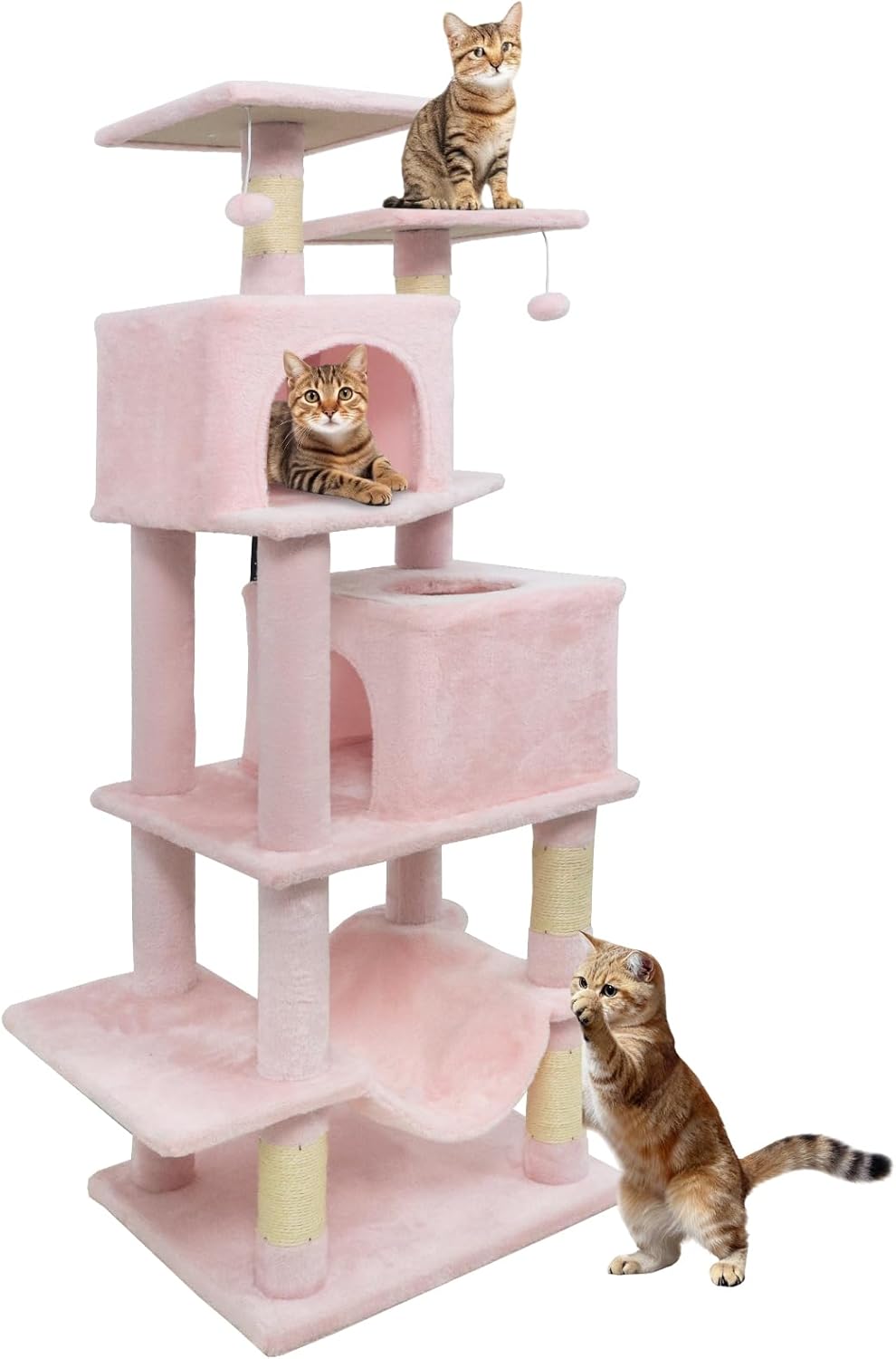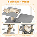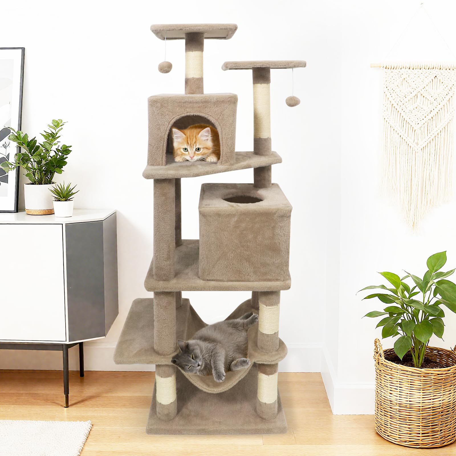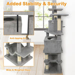 The cat tower features dual condos that offer private, enclosed spaces for restful naps and quiet moments. The lower condo comes with skylight & entry, enabling cats to hide and seek. 2 elevated perches give curious cats the ideal spots to survey their kingdom from above, while the cozy hammock provides a soothing swing for ultimate relaxation. Natural sisal-wrapped scratching posts help maintain healthy claws and safeguard your furniture from scratches. Playful dangling plush balls promise hours of entertainment, stimulating your cat’s hunting instincts. The wide base paired with a secure anti-tipping kit, ensures remarkable stability for safe daily play. Finished in soft plush fabric, the cat tower becomes an inviting haven, making every climb, leap, and nap a delightful experience.