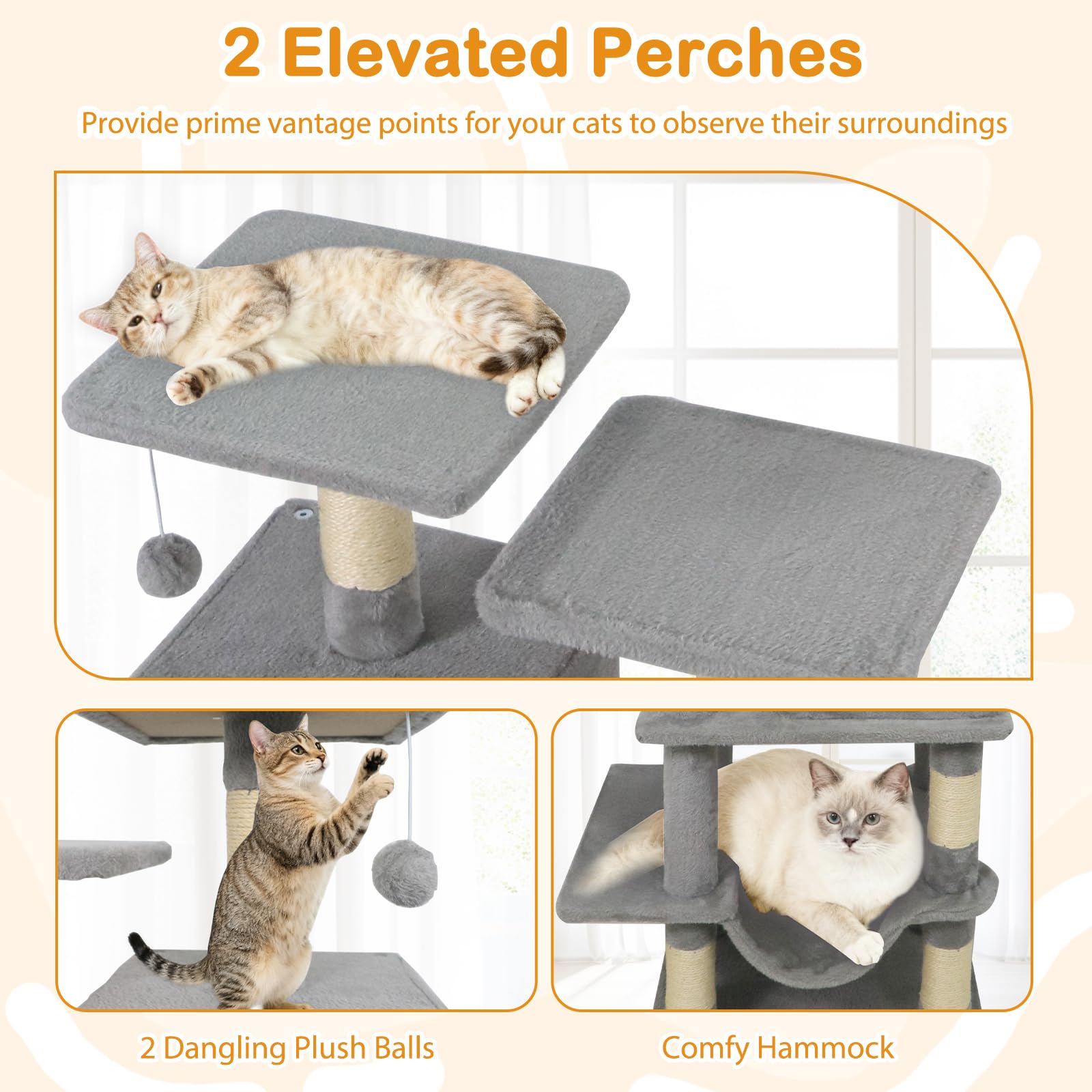 2 elevated perches provide prime vantage points for your cats to observe their surroundings
