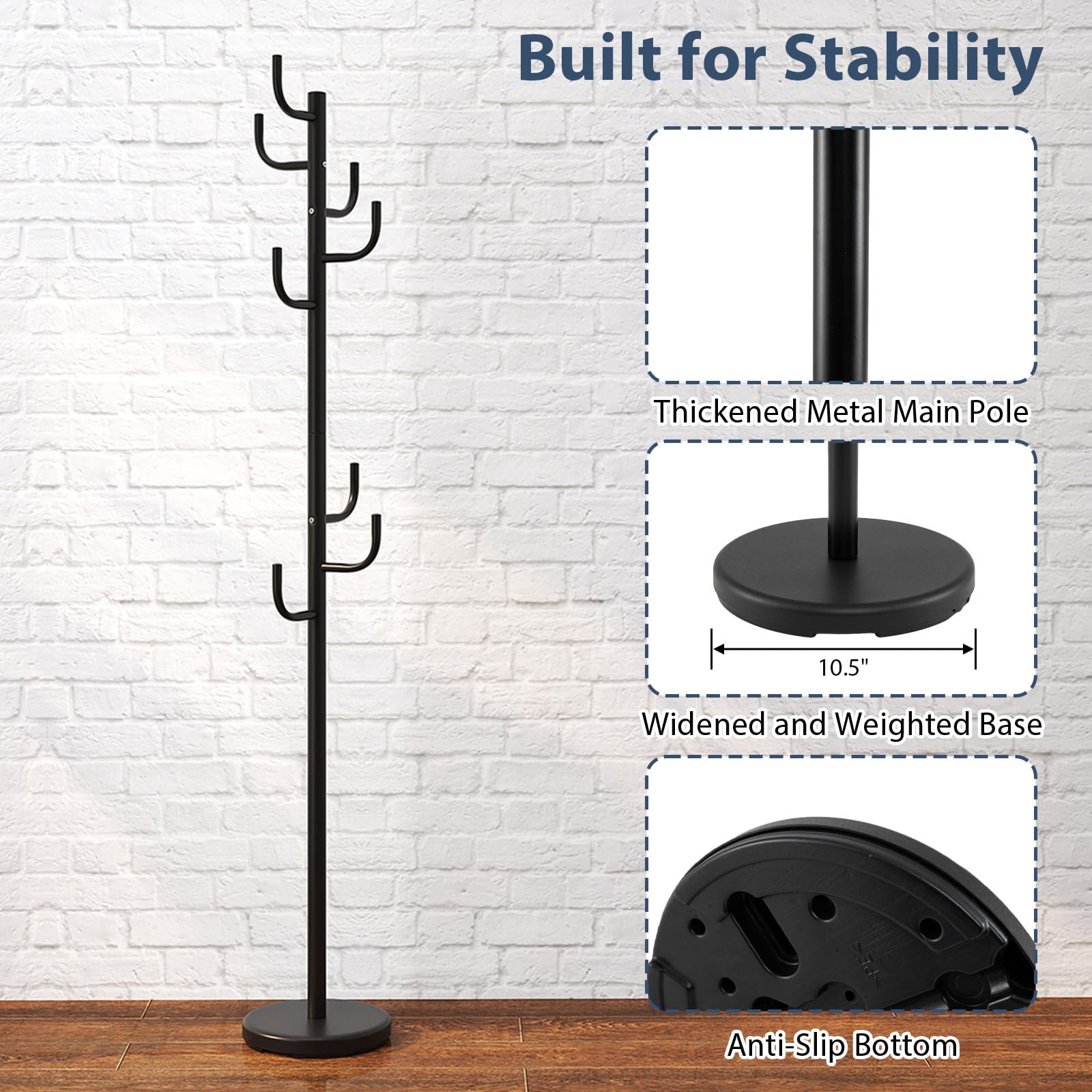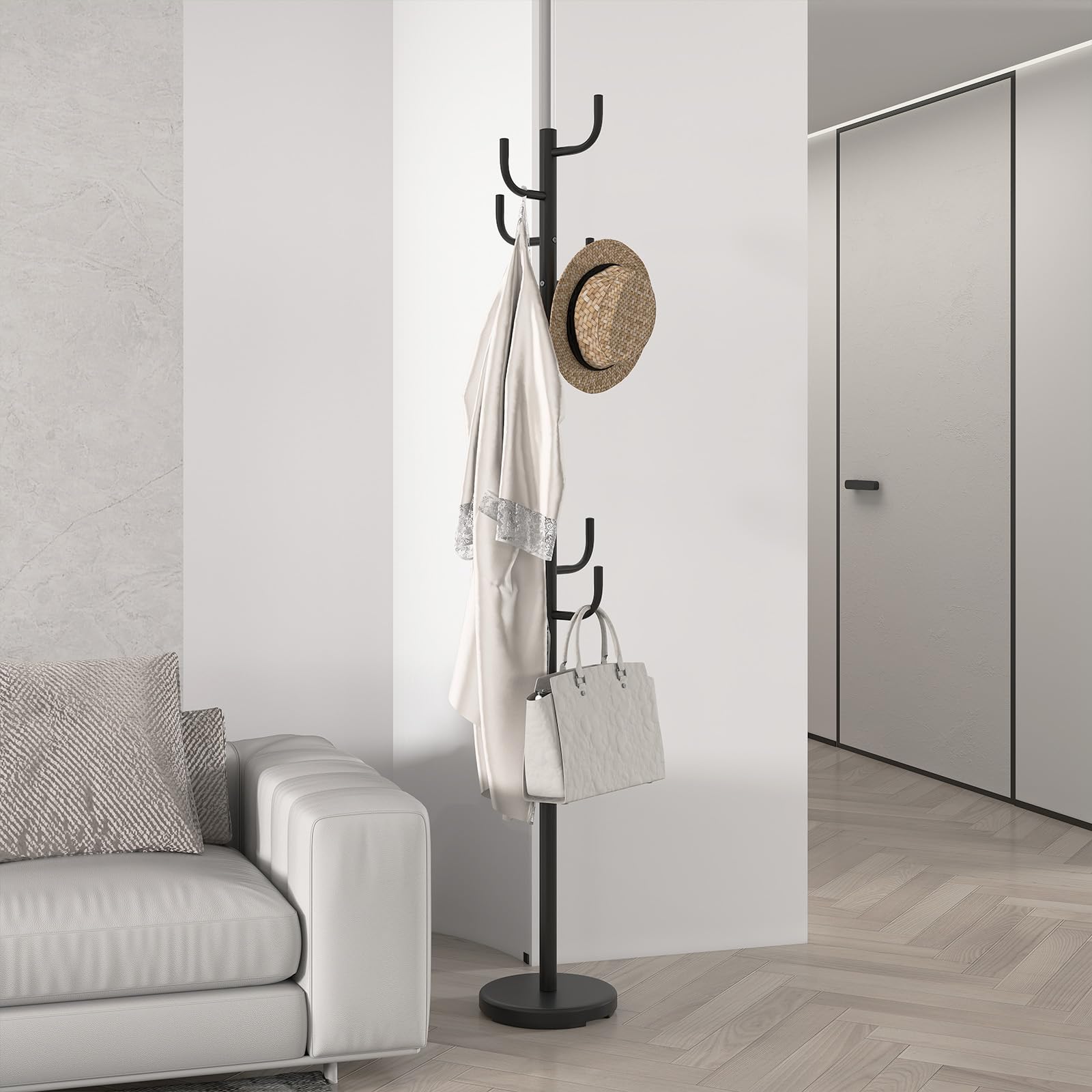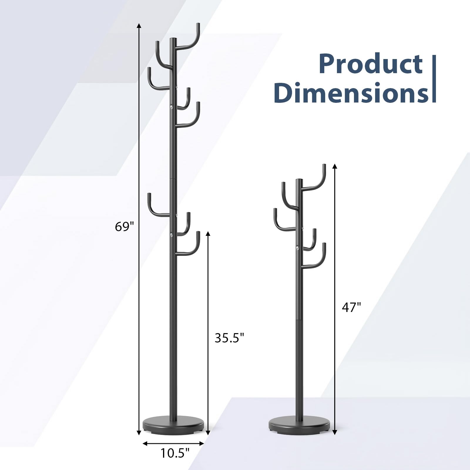 This coat tree with 8 hooks, featuring a cactus-inspired design, not only adds a stylish accent but also efficiently maximizes vertical space in hallways, bedrooms, or offices. Constructed from thick metal tubes, the coat and hat hanger boasts a weighted base with a non-slip bottom for superior stability. The 8 L-shaped hooks with rounded ends securely hold a wide range of items – such as coats, bags, and umbrellas. Additionally, the height-adjustable metal coat rack stand can be easily customized between 47 and 69 inches by adding or removing pole sections, making it a versatile and practical solution for users of various heights.