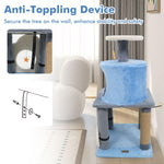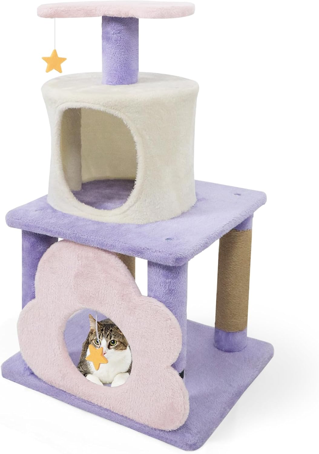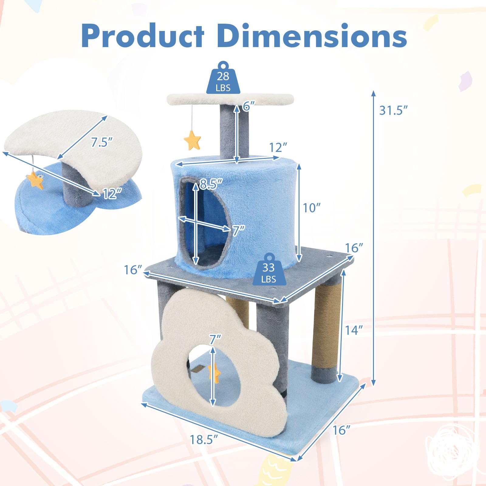 Give your cat a playful and cozy home with this uniquely designed cat tree, featuring vibrant colors and captivating moon, star, and cloud patterns that instantly light up any room. Designed for stability, it comes with an anti-toppling device to keep your adventurous cats safe as they leap and climb between the 4 spacious levels. With a private condo, a plush moon-shaped top perch, and a roomy cloud-inspired cave, your feline will always find the perfect spot to relax or nap. Natural jute scratching posts satisfy your cat's need to scratch while protecting your furniture from damage. And there is an interactive star-shaped hanging toy, encouraging exercise and keeping cats engaged and happy. This cat tree is more than just a pet accessory - it's a charming piece of home decoration and a joyful playground your cat will love.