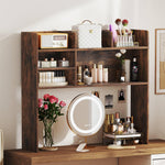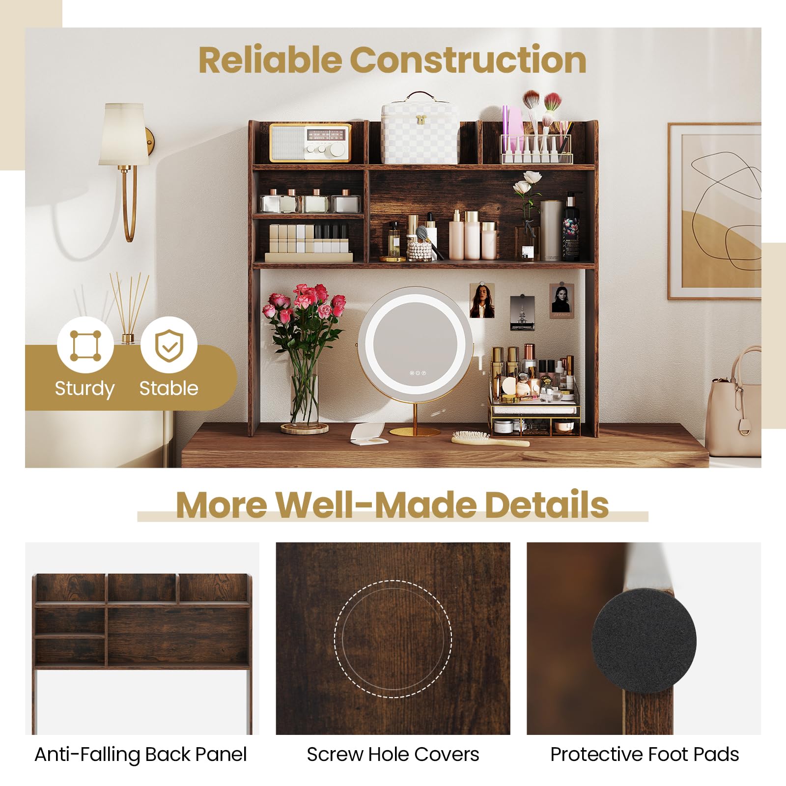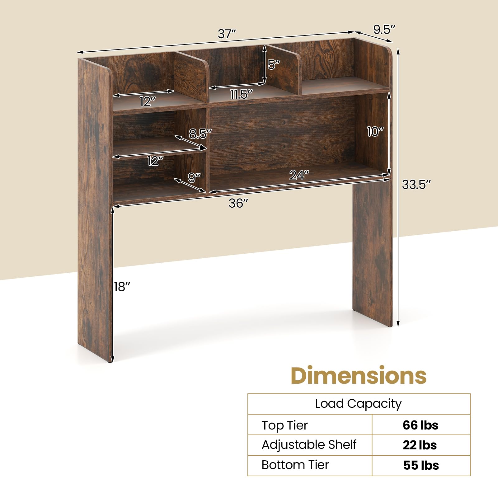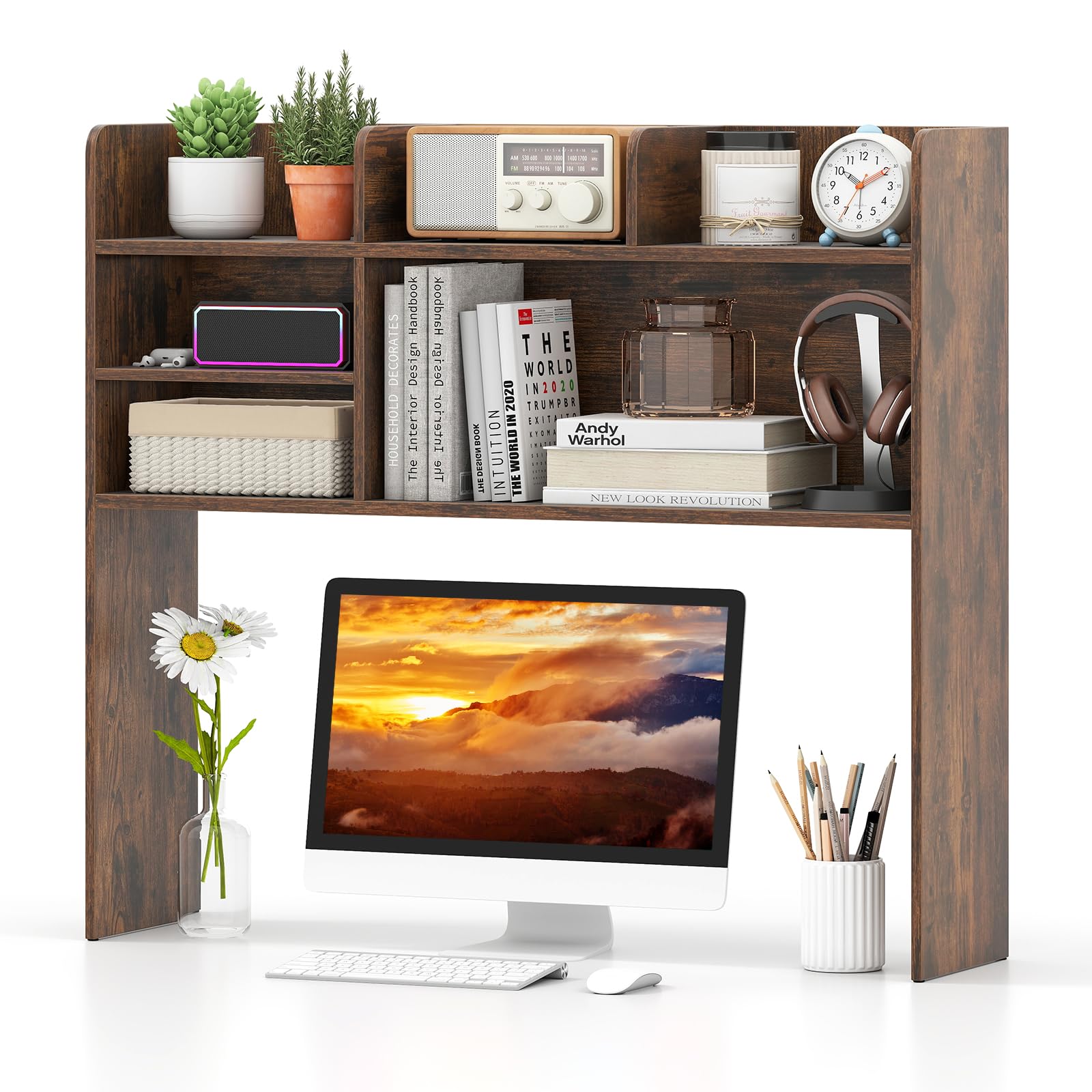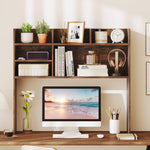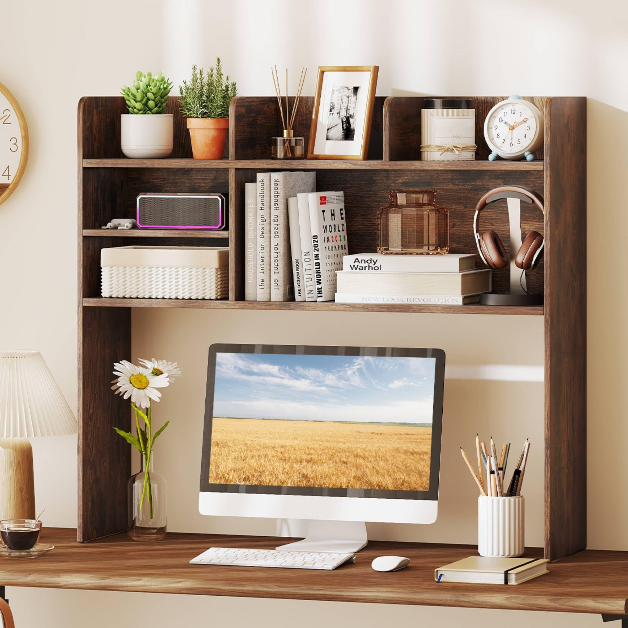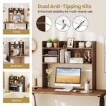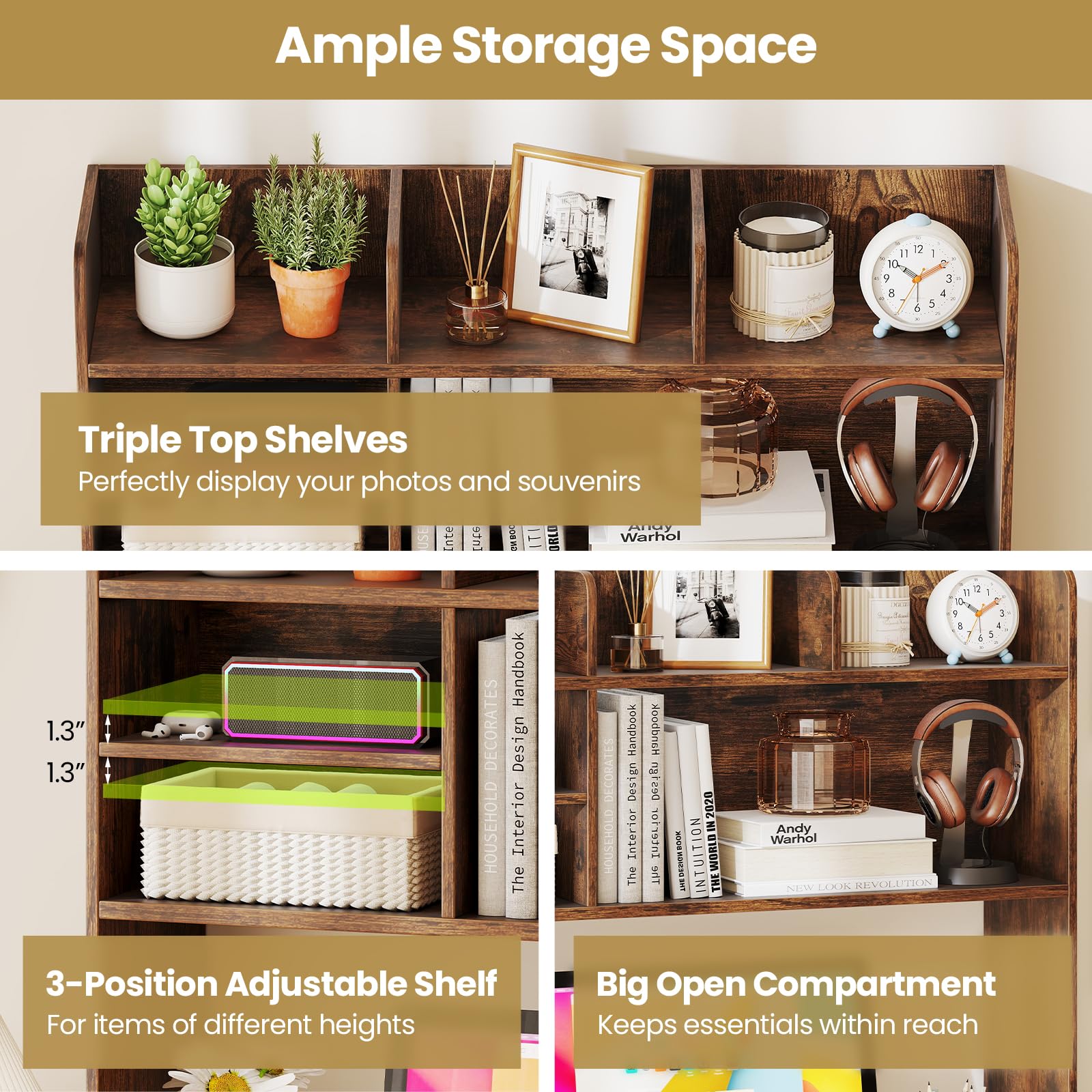 Enhance your workspace with a stylish and functional desktop bookshelf that offers ample storage space with 3 top shelves, a large open compartment, and a 3-position adjustable shelf for items of different heights. Its monitor-friendly design provides a spacious bottom clearance suitable for monitors up to 32 inches, ensuring a clutter-free area. The desktop storage hutch's reliable construction is sturdy and stable, with dual anti-tipping kits and protective foot pads to safeguard your desktop from scratches. More well-made details, such as screw hole covers, add to its sleek and modern design, making it a sophisticated addition to any room while blending seamlessly with any decoration. Perfect for dorm rooms, bedrooms, home offices, and kitchens, this versatile piece is a must-have for compact spaces, allowing you to store a variety of items in a tidy and organized manner.