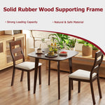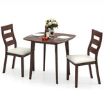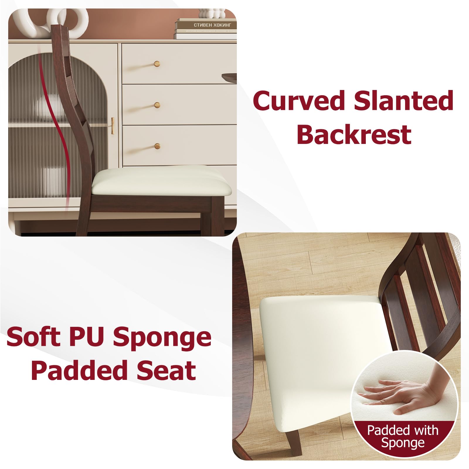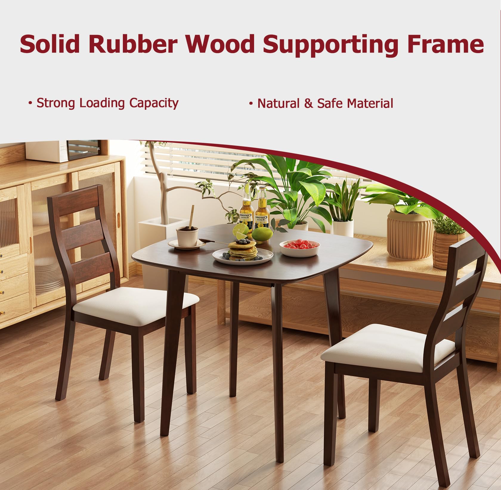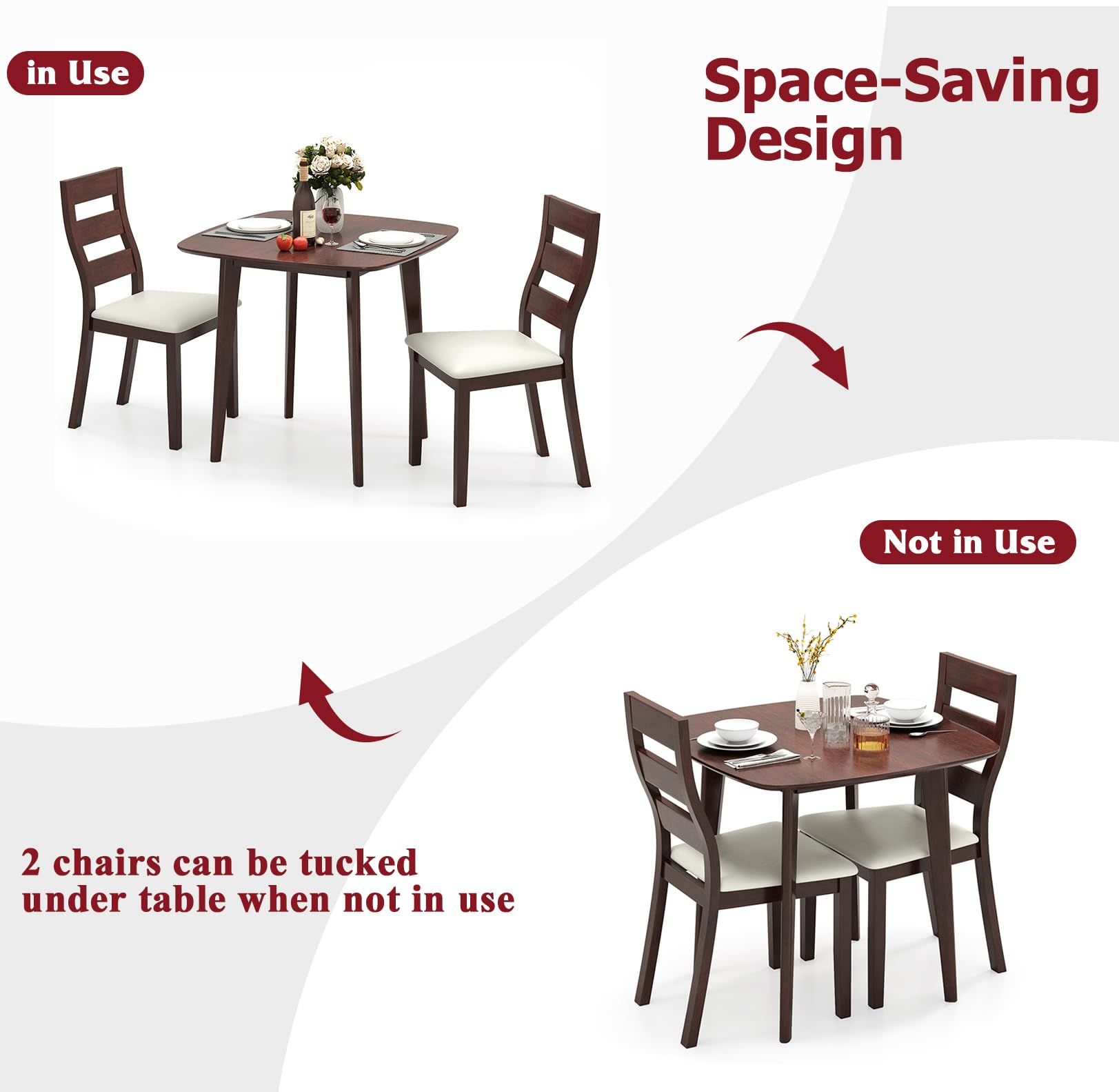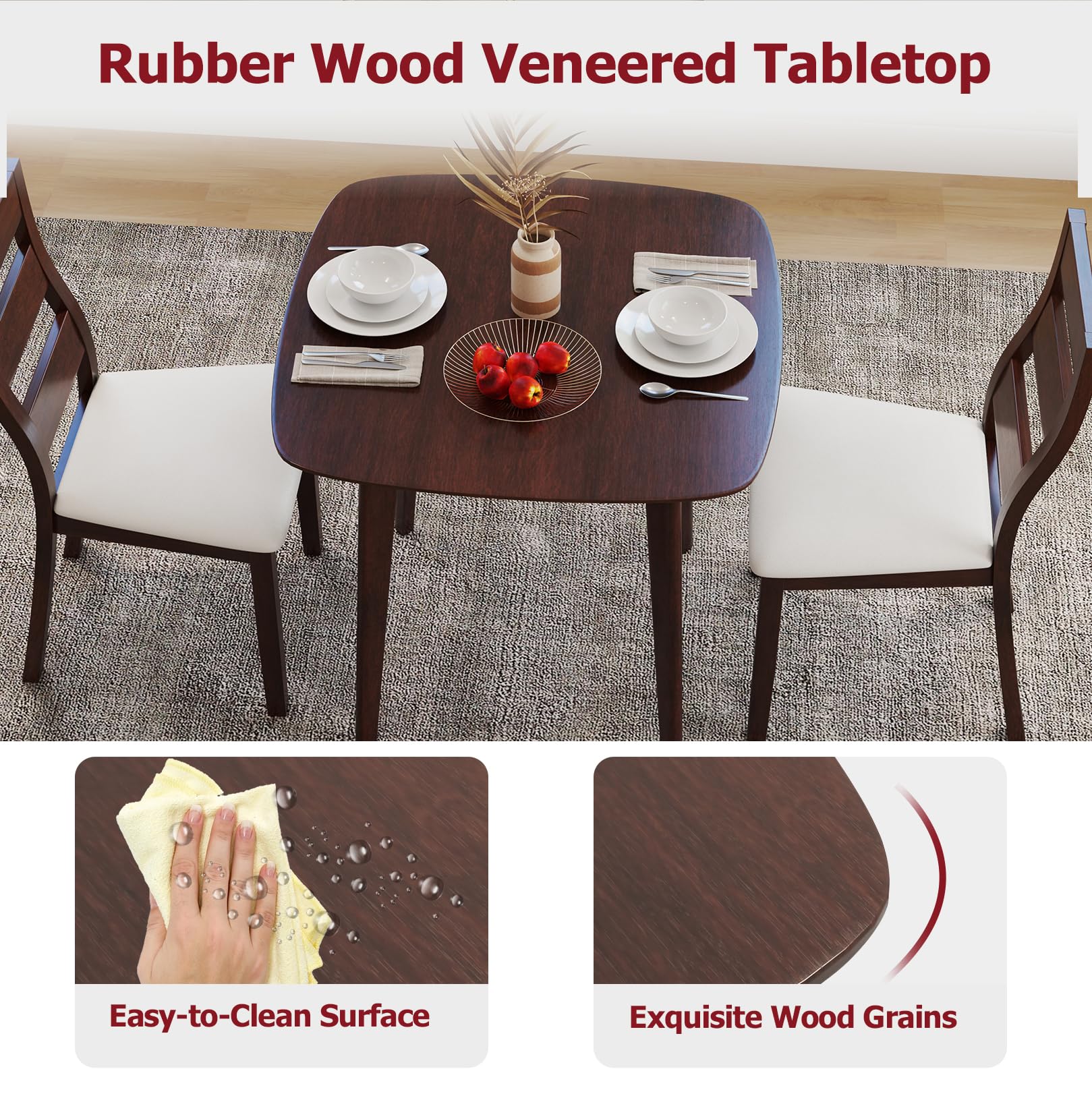 Featuring a farmhouse style design, the kitchen table boasts a rubber wood veneered tabletop. The sturdy frame of the dining set is crafted from natural rubber wood, providing a solid foundation. The chair backs are ergonomically curved to accommodate the body's contours, while the upholstered seats offer a comfortable dining experience. The seats are upholstered with easy-to-maintain PU leather. This 3-piece dining table set not only has aesthetic appeal and durability but also offers a space-saving design. You can neatly tuck the chairs under the table when not in use, optimizing your living space, ideal for smaller dining areas or apartments.