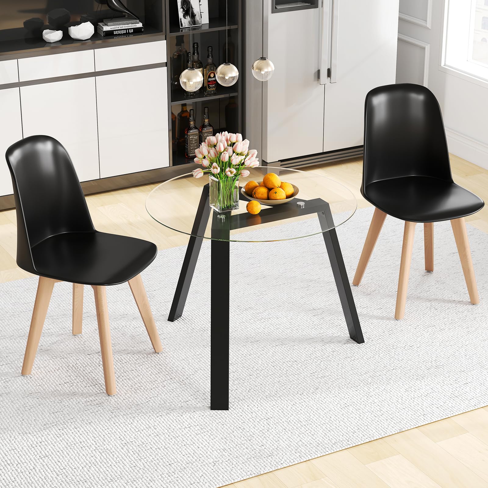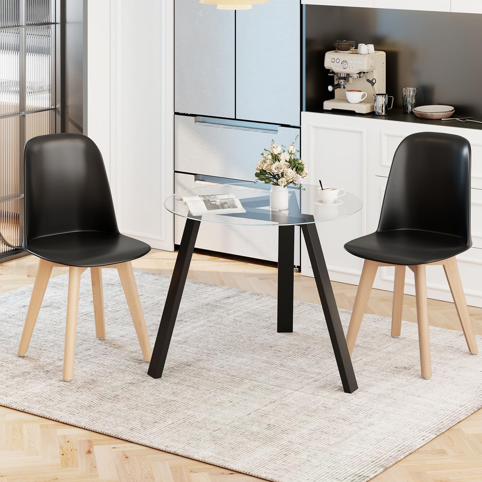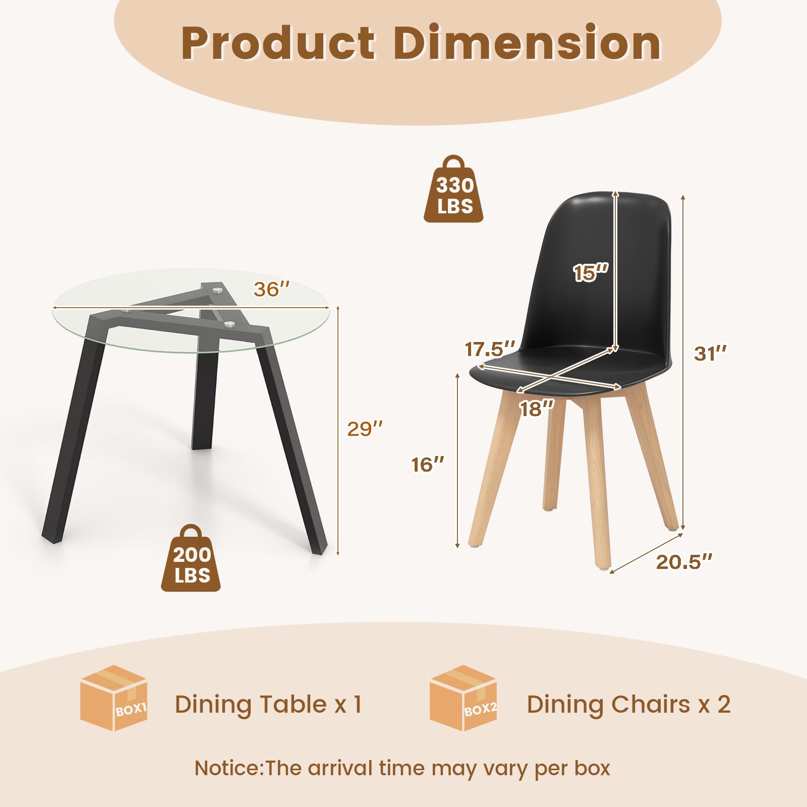 Elevate your dining space with this 3-piece round dining set, featuring a robust tempered glass top that’s scratch-resistant, waterproof, and easy to clean. The ergonomic chairs with contoured backrests and waterfall-edge seats provide lasting comfort for family meals or long chats. Built with a solid rubber wood frame, sturdy beech wood legs, and anti-slip pads, each chair supports up to 330 lbs with reliable stability. Perfect for small spaces, the compact round table allows the chairs to tuck neatly underneath, maximizing your room. With its modern yet timeless design, this dining set blends effortlessly with any decoration, from contemporary to classic.