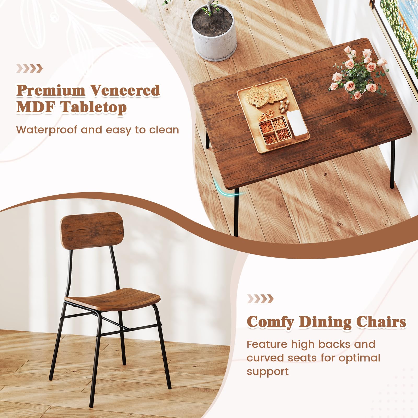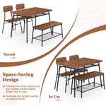 Equipped with a rectangular table, a bench, and 2 chairs, this dining set is perfect for family gatherings or entertaining guests. Both the dining table and bench come with a storage rack, providing ample space to store dining essentials while keeping them within easy reach. Additionally, the bench doubles as an end-of-bed bench or shoe bench, adding versatility to your home. The chairs feature ergonomic backrests for a comfortable sitting experience. Supported by sturdy metal frames, this space-saving kitchen table set is built to last. The warm-tone wood grain finishes and sleek metal tubes effortlessly combine rustic charm with modern design elements, making it a focal point that complements various interior styles.