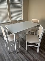 Our 5-piece dining set includes a dining table and 4 padded dining chairs, perfect for family meals and gatherings with friends. The set is crafted with solid rubberwood legs, ensuring durability and longevity. The chairs feature padded cushions on the seat and backrest, filled with soft sponge and covered in waterproof, stain-resistant PVC leather for a comfortable seating experience. When not in use, the 4 chairs can be conveniently stored under the table, ideal for smaller dining spaces. Choose from two color options: cherry finish with deep brown upholstery for warmth and elegance, or white finish with dark brown upholstery for a modern look.