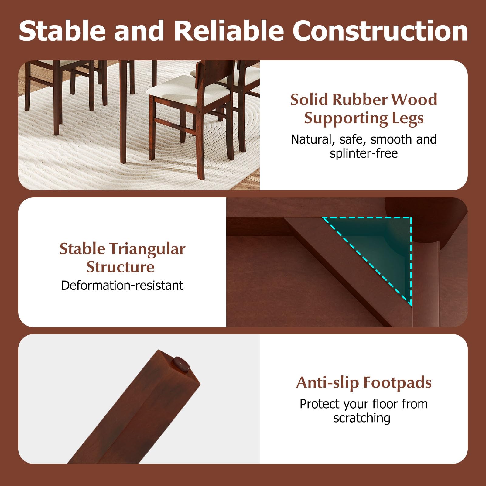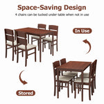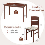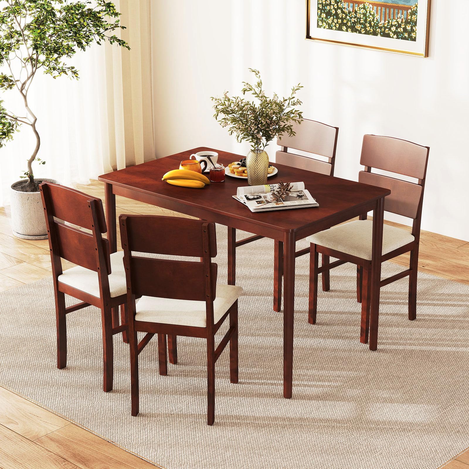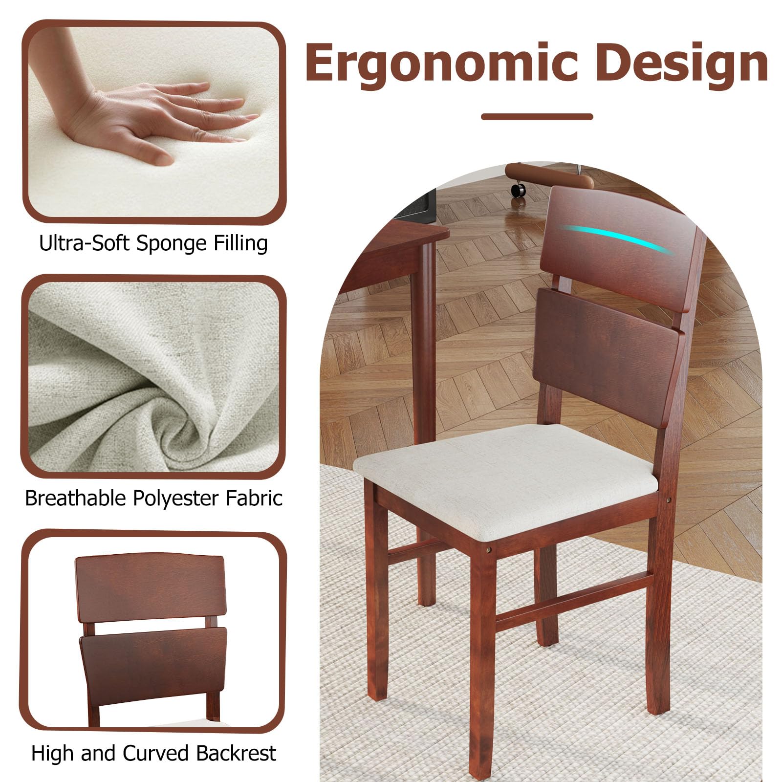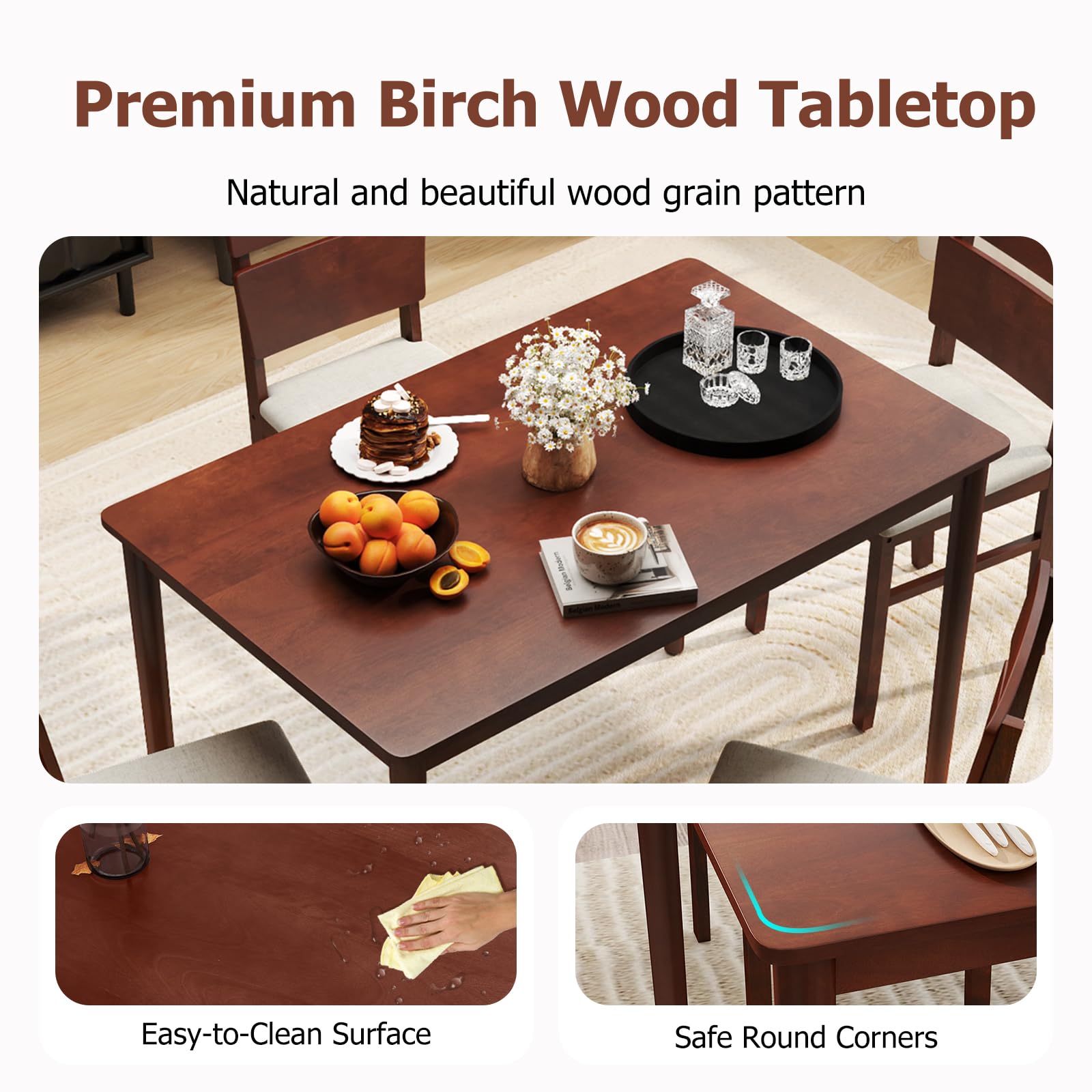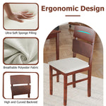 Elevate your dining experience with our stylish 5-piece dining table set! This complete set features a sleek rectangular table and four beautifully upholstered chairs, providing comfortable seating for family dinners, entertaining friends, or even remote work. The rich warm walnut finish and authentic wood grain details bring timeless farmhouse charm to your space. Built with solid rubberwood legs and reinforced triangular support, our dining set offers exceptional stability for daily use. Each chair is ergonomically designed with thick cushioned seats and a 17.5” high backrest for superior comfort during meals. When not in use, all four chairs tuck neatly under the table – perfect for cozy apartments and small-space living.