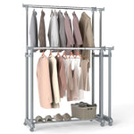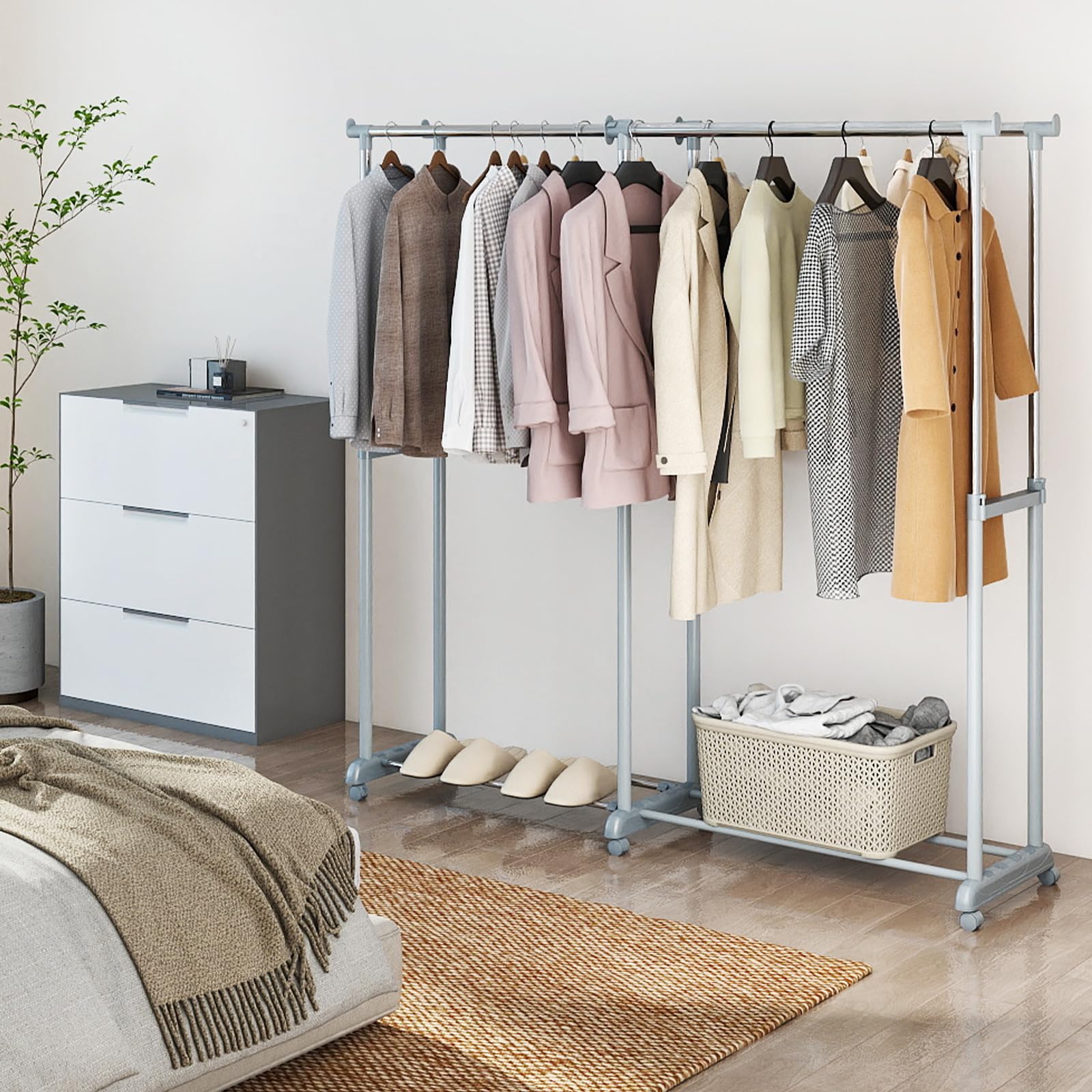 This portable clothes organizer offers versatile storage with adjustable dimensions, expanding in height from 37” to 66.5” and in width from 42” to 66”, accommodating various spaces and user preferences with ease. Featuring 4 main hanging rods, 3 side rods, and 2 lower rods positioned 4” above the ground, the rolling metal garment rack efficiently organizes clothing, shoes, and accessories while optimizing floor space. Built from sturdy metal tubing, the double rods clothing rack promises to withstand frequent use, with details like 11” spacing between rods for proper airflow and protective end caps that prevent hangers from slipping. Mobility is enhanced by 6 universal wheels, 2 of which lock securely to maintain stability when stationary.