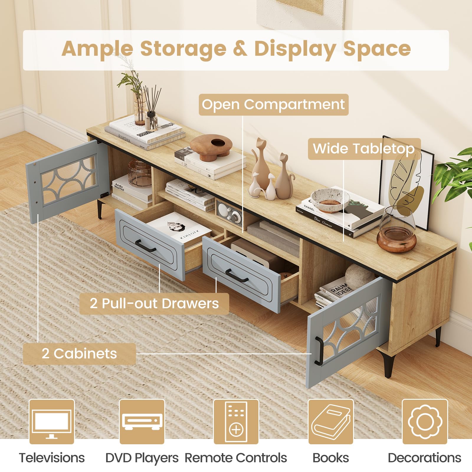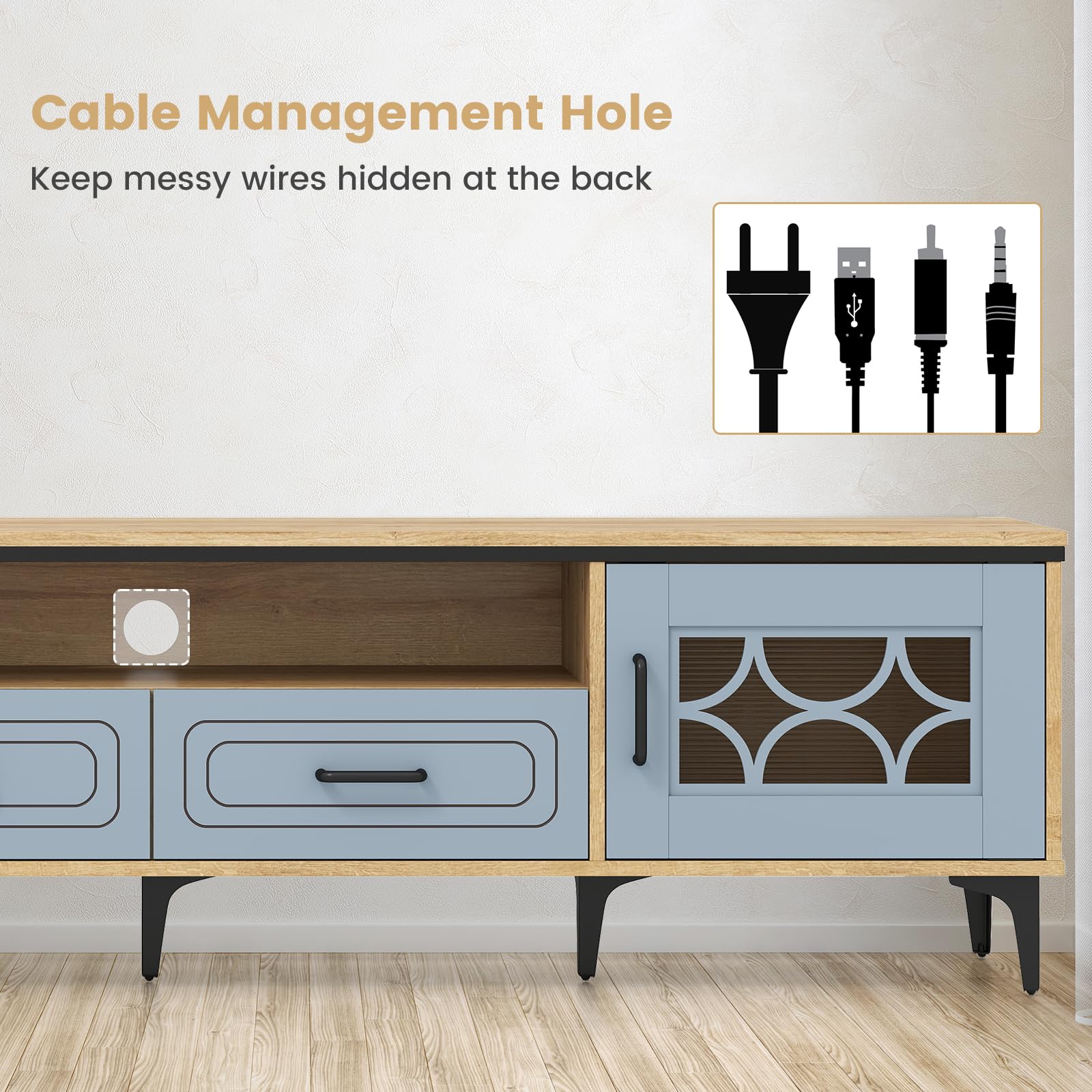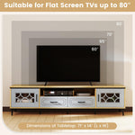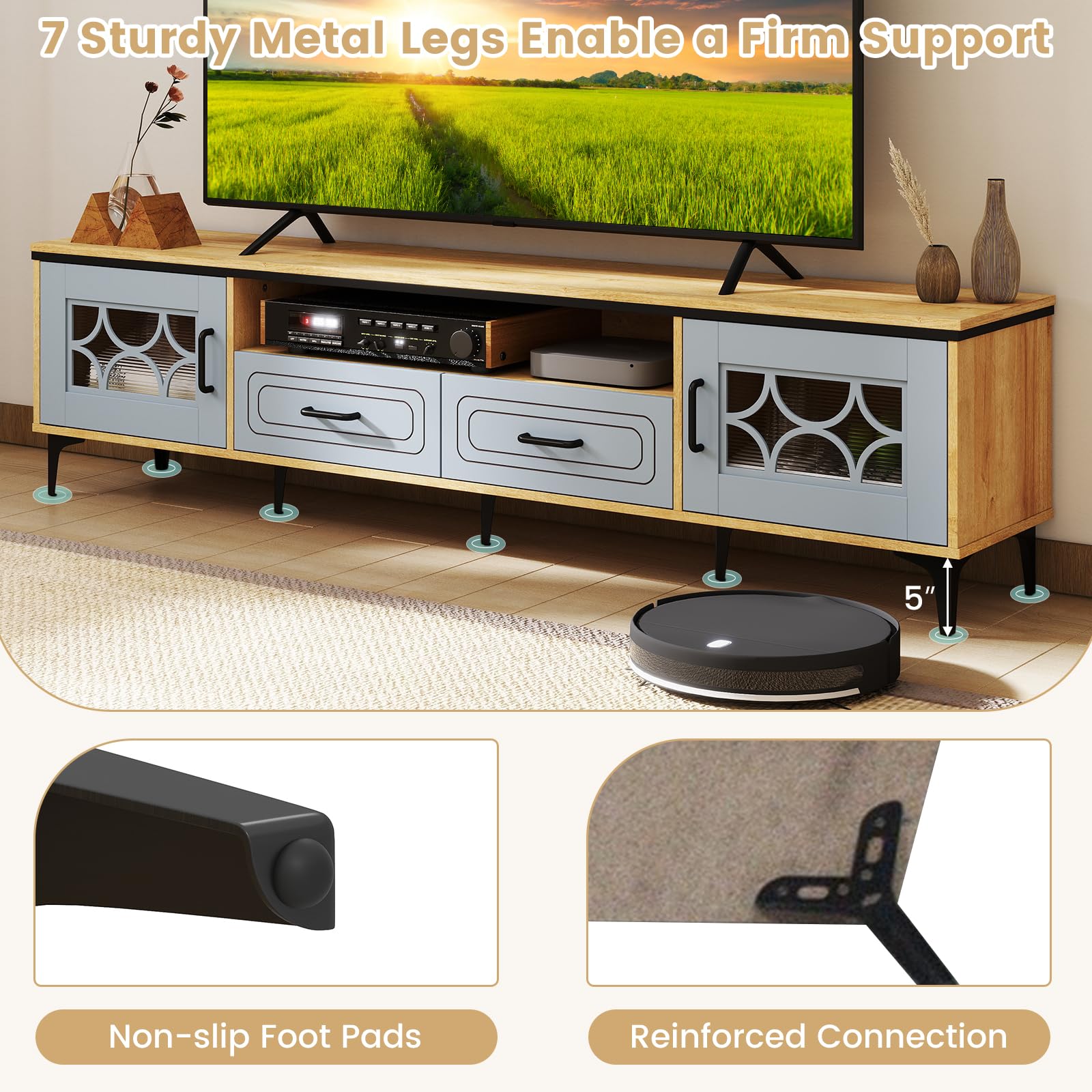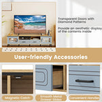 Elevate your entertainment space with this TV stand, which is suitable for flat screen TVs up to 80”. Featuring 2 pull-out drawers and large cabinets, this media console table offers ample storage options for your entertainment essentials. The transparent doors with diamond patterns provide an aesthetic display of the contents inside. An additional open compartment provides storage space for your DVD players, remote controls or gaming console. The TV stand is supported by 7 raised metal legs for higher stability. For added convenience, the cable hole at the back helps manages and hide wires, maintaining a clean and organized look. This farmhouse media console combines style and functionality, making it a great focal point for your home.