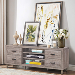 Enjoy your favorite movie or TV show in better viewing surroundings. And this entertainment center will help you perfectly. Its premium performance can be seen in its contemporary style and humanized design. It shall add unique aesthetic beauty to your living room or bedroom while ensuring great practicality. Its wide tabletop can accommodate flat-screen TV up to 65". Till remains extremely stable to hold the television since it is equipped with 6 thickened legs. Besides, the open storage shelves are designed to help you store media devices while the 3 cable management keeps wires organized in case of messy conditions. There are also 4 large drawers to expand storage space further. No need to worry about assembly, which is fairly easy for you.