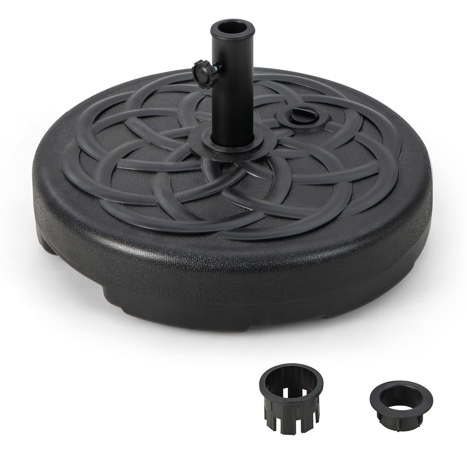 With a 23L(water) large capacity, the round umbrella base stand can be filled with water, sand, or water and sand to enhance weight. Thus, your patio market table umbrella will be supported stably on windy days. Adopting premium HDPE material, the umbrella base is crack-resistant under kinds of weather conditions. Equipped with a turning knob and 2 plastic inserts, the fillable umbrella base is compatible with most 10 ft patio umbrellas. Besides, with elegant patterns, the exquisite umbrella base is a perfect addition to your porch, patio, and poolside. Weighing only 5.5 lbs and coming with a hidden handle, transporting the umbrella stand will not be a strenuous job. Likewise, assembly is also simple for you!