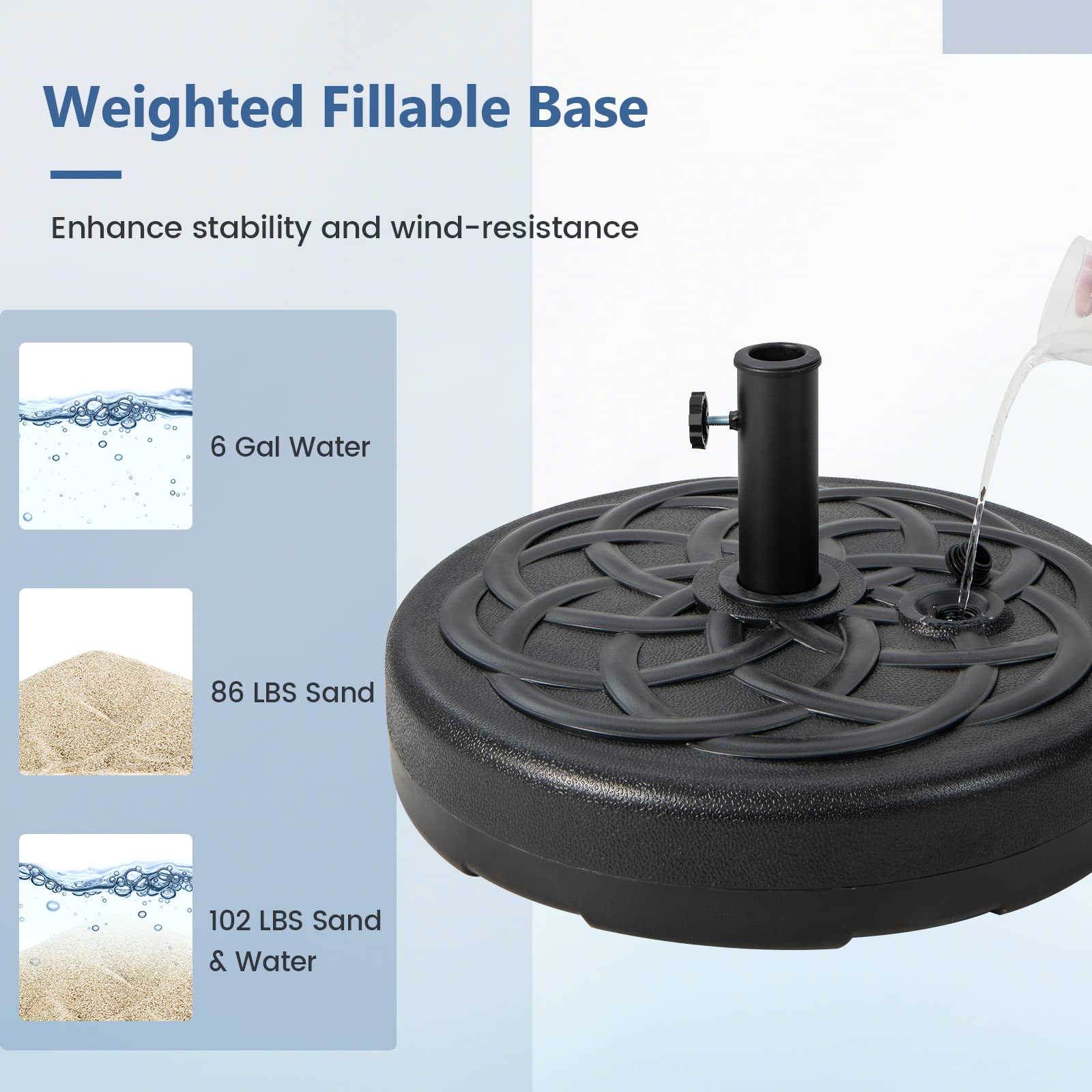 - Weighted Fillable Base: The umbrella base stand can be filled with 5.3 Gal water, 86 lbs sand, or 102 lbs sand and water to enhance stability and wind resistance. Thus, your large patio table umbrella will be reliably supported in windy conditions.