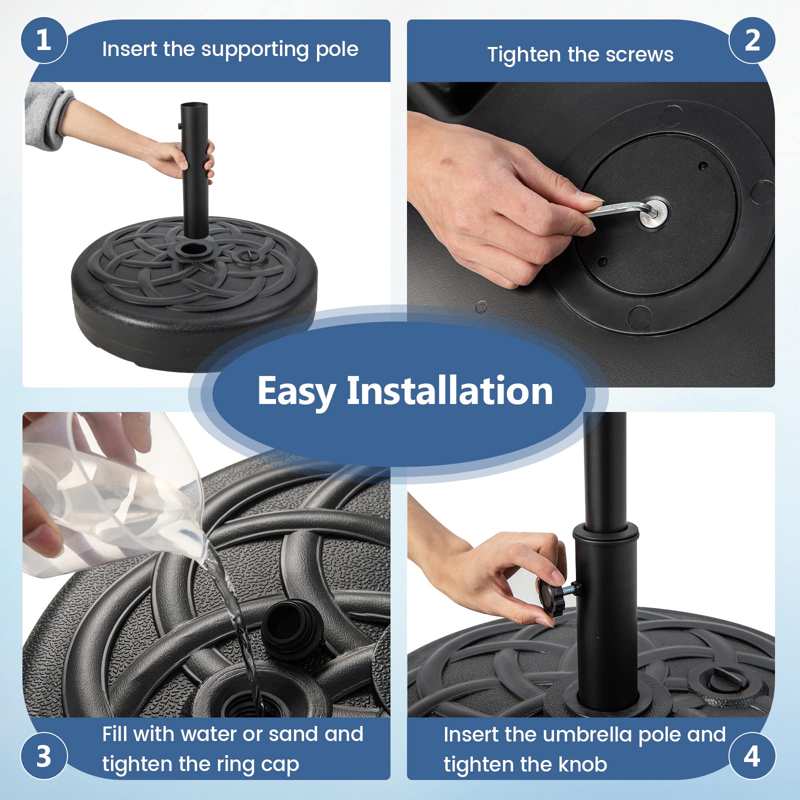 - Tool-free Installation: Assembly of the weighted umbrella base is a breeze, all you need to do is to insert the supporting pole, tighten the screw, fill it with water or sand, and tighten the ring cap. Then you can install the umbrella pole and tighten the knob to finish the assembly.