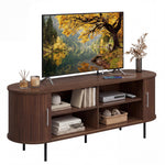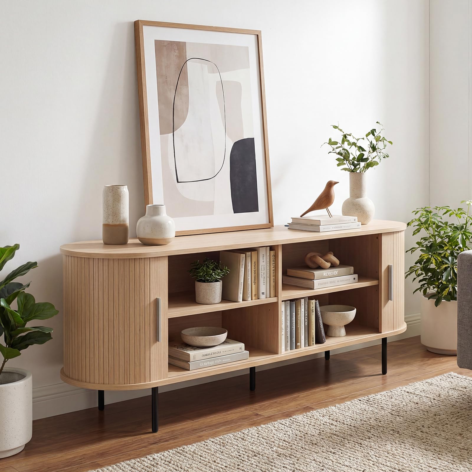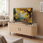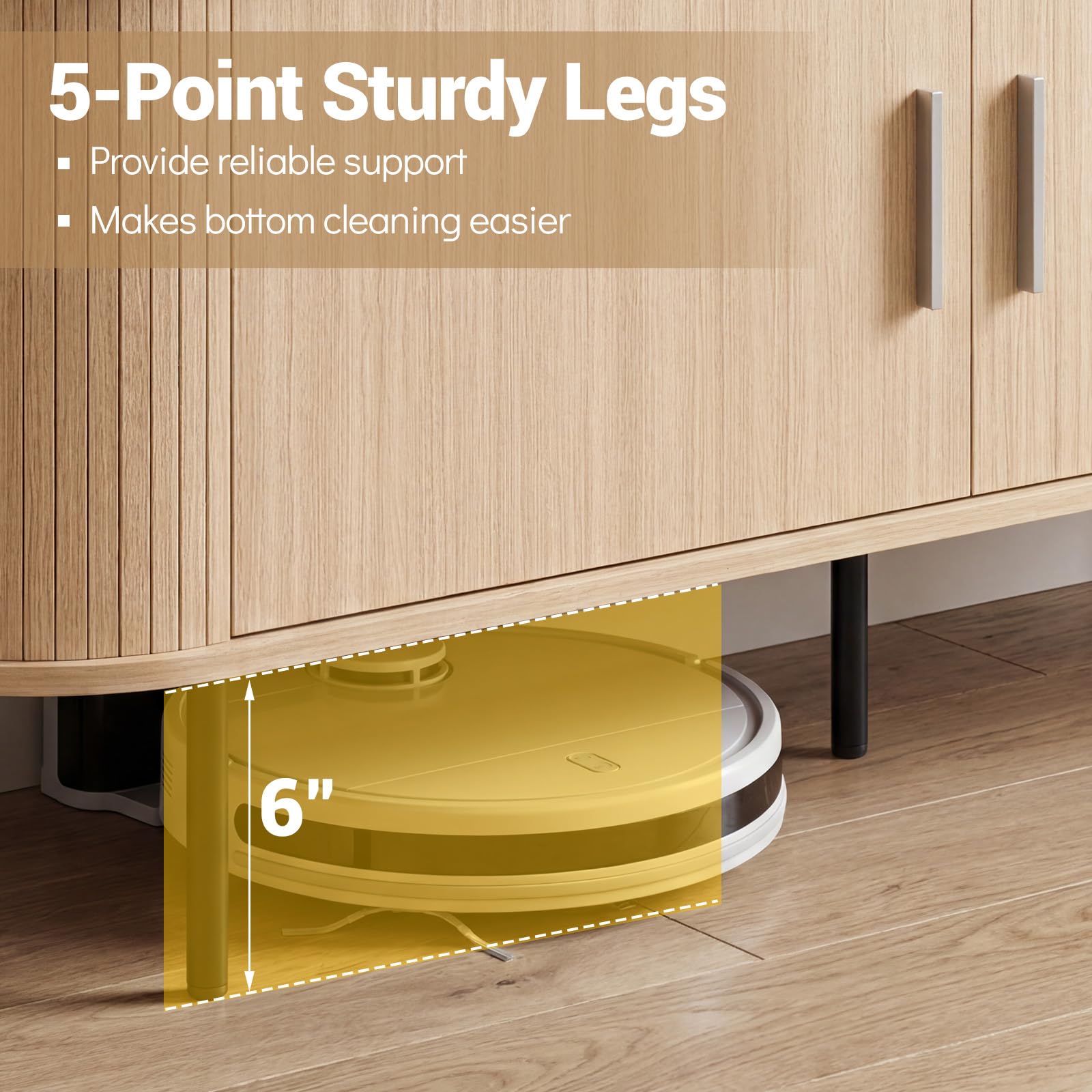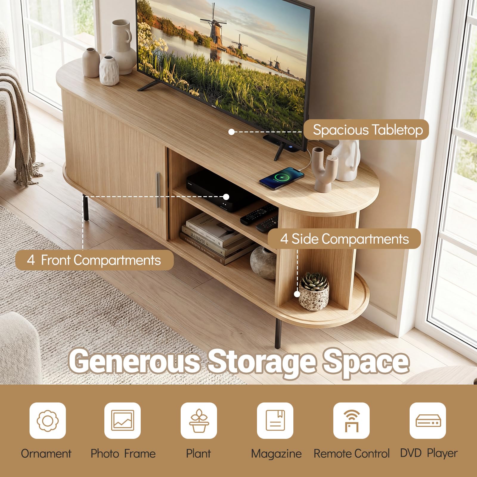 This stylish mid-century TV stand combines elegant wood-look finish and rounded edges with practical design, making it perfect as a TV cabinet, entertainment center or display unit. Plus, supported by 5 sturdy metal legs with 6” ground clearance, this media console ensures stability and easy cleaning. Featuring a wide tabletop suitable for TVs up to 60 inches, this storage cabinet offers ample space for your electronics and decorations, while 4 front and 4 side hidden storage compartments keep your living area organized. Moreover, the built-in charging station with AC outlets, USB and type-C ports lets you conveniently power multiple devices at once.
