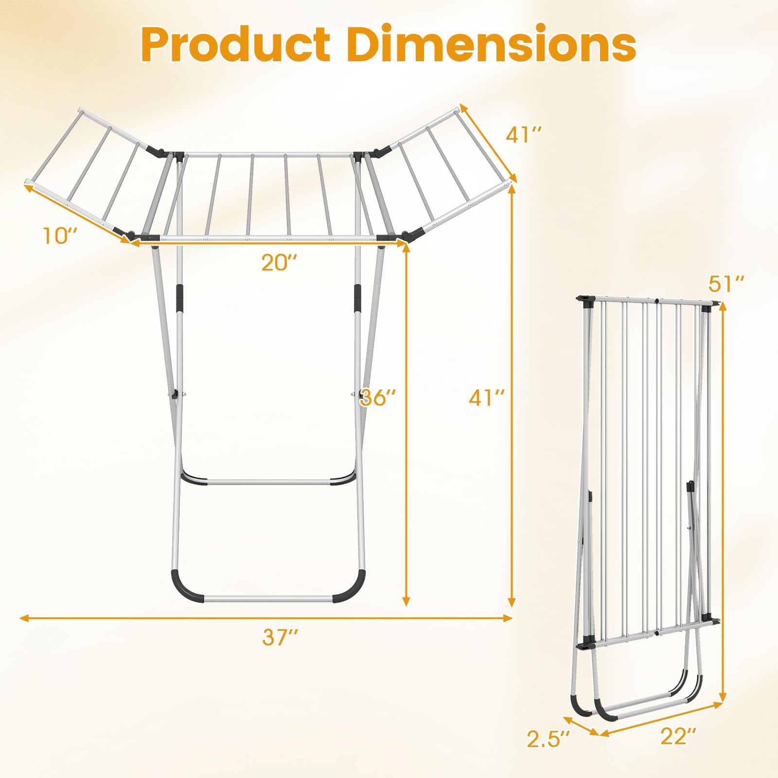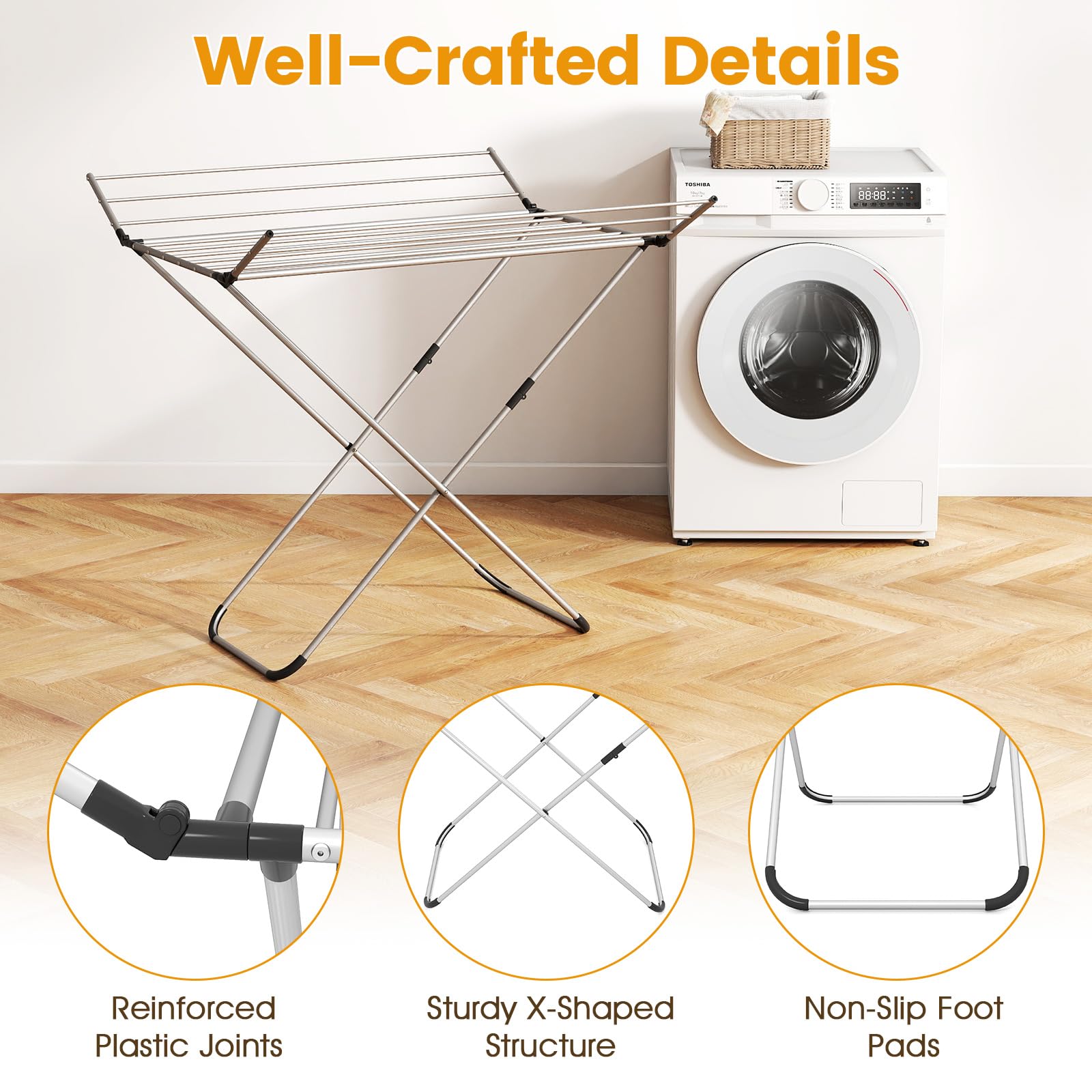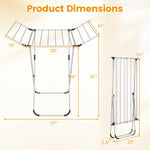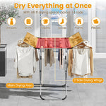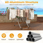 This drying rack is made from robust aluminum with a rustproof frame and thick tubes for long-lasting strength and scratch resistance. It features a large drying area with 14 poles spread over a main section and 2 foldable wings, maximizing space for shirts, pants, towels and more. The X-shaped structure provides stable freestanding support, complemented by protective feet to prevent floor damage. Thanks to its compact fold-flat design, the side wings fold inward smoothly, making it perfect for small apartments or limited spaces. Designed for both indoor and outdoor use, this foldable clothes drying rack ensures efficient drying in various environments.