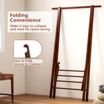 Crafted from solid rubber wood with an A-shaped frame, this clothes hanger provides a stable and reliable solution for hanging garments securely. The design includes a sturdy hanging rod suitable for coats, hats and bags, while a bottom shelf offers additional storage for shoes and boxes. Its folding feature allows for effortless collapsing and space-saving storage, ideal for small rooms or when moving houses. Additionally, the garment organizer's splinter-free surface protects your clothes, and the 7-inch floor clearance simplifies cleaning and adds extra storage options.