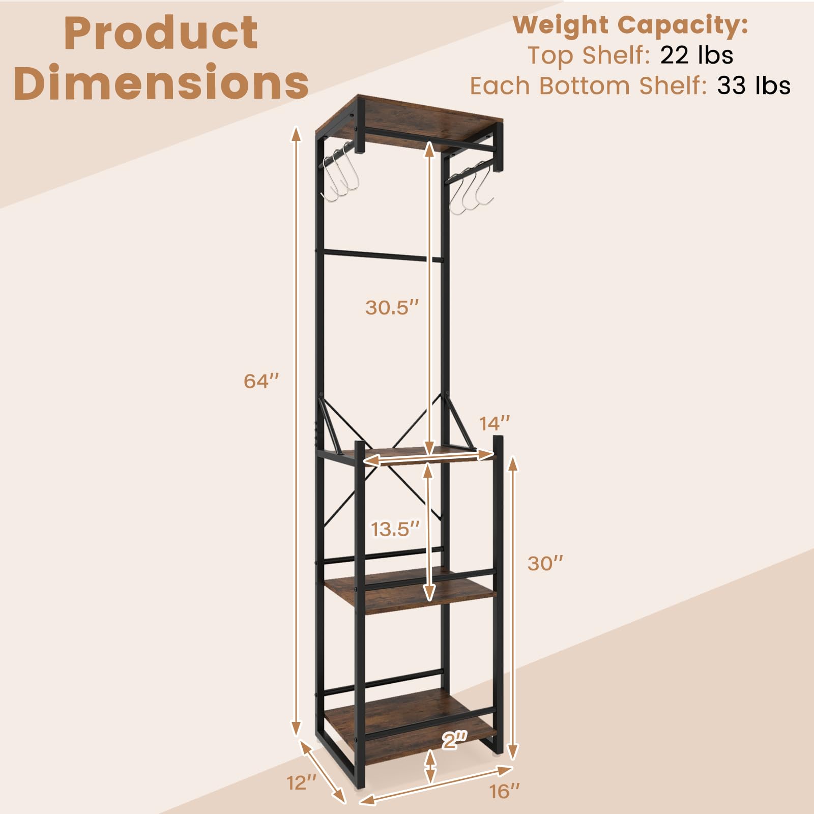 Featuring a sturdy metal frame with anti-tipping devices and stable triangle structure, the clothes stand with well-made details offers reliable support and safety. Multiple hanging rods, hooks, and layered shelves provide ample room for jackets, hats, bags, shoes, and even decorative items. Perfect for entryways, bedrooms, or living rooms, this stylish industrial-style organizer combines functionality with elegance. Say goodbye to clutter and enjoy a beautifully organized home with this space-saving coat rack.