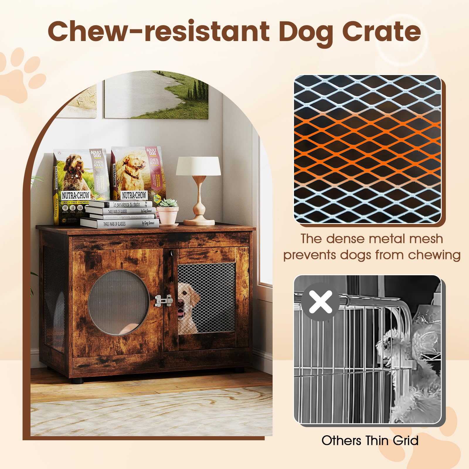 Featuring a dense metal mesh that is highly chew-resistant and ensures the longevity of the crate. The sturdy construction and non-slip foot pads provide a safe and stable environment for your dog. More than just a kennel, this 3-in-1 Versatile Cabinet can be used as a side table or storage cabinet, with a spacious tabletop for dog accessories or decorative items. The convenient lockable door allows your dog to easily enter and exit, while the secure door latch prevents escapes. Equipped with a breathable mesh window, this indoor pet kennel promotes good air ventilation and includes a round translucent window for easy monitoring of your pet. With internal dimensions of 30.5” x 16.5” x 21” (L x W x H), it is ideal for small to medium-sized dogs weighing up to 88 lbs.