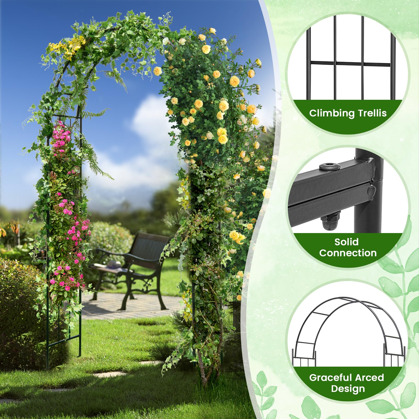 A perfect decorative entrance for your garden! Crafted of powder-coated metal frame, the garden arch shows perfect performance in great sturdiness and durability. The trellis stands on its own. Also, you can fix the metal archway with ground stakes for higher stability. The climbing trellis offers vine support and is ideal for wisteria, clematis and vines, etc. You can also decorate the arbour with colorful balloons, lights, or tulle, adding a different flair to garden, lawn, and backyard. Whether used for wedding, anniversary, birthday party and other ceremonies, the metal garden arch will be of great satisfaction.