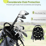 This golf club carry bag features 8-way top dividers that allow for seamless access and organization of your clubs. 3 integrated handles enhance portability, making it easy to move around the course. For further convenience, this golf bag is equipped with an adjustable dual shoulder strap and a padded carrying handle. The bag offers ample storage solutions with 5 zippered pockets, including a soft-lined valuables pocket to safely store personal items such as watches, phones, etc. Additional features include a glove holder, a towel ring, a detachable rain hood and an umbrella holder offer added convenience.