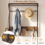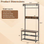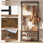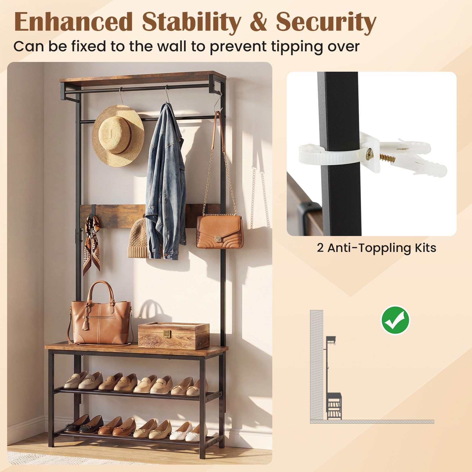 This all-in-one hall tree combines a coat rack with shelf, rod and hooks, a shoe rack and a bench to optimize your space. Crafted from robust metal square tubes and equipped with anti-toppling kits, it ensures lasting stability and safety. The rustic wood grain panels add a warm industrial aesthetic that fits effortlessly in hallway or bedroom. With an easy-to-clean surface, this elegant and sturdy coat rack is the perfect addition to keep your clothes organized and accessible.