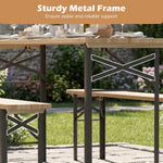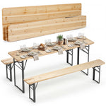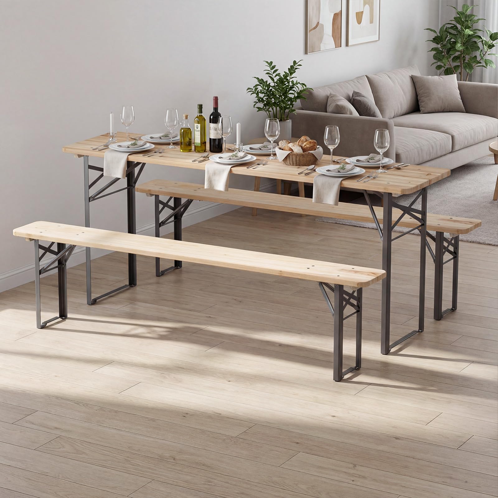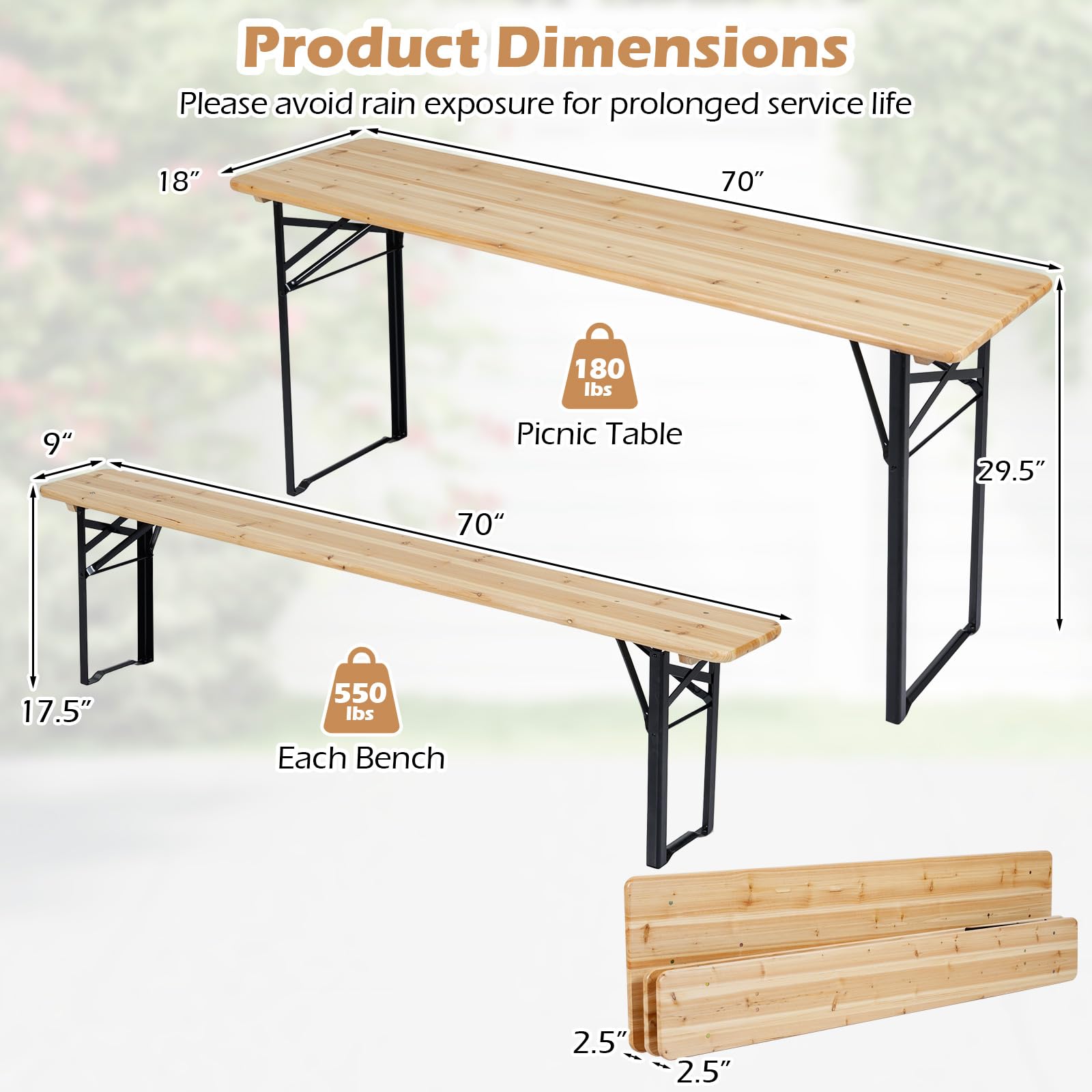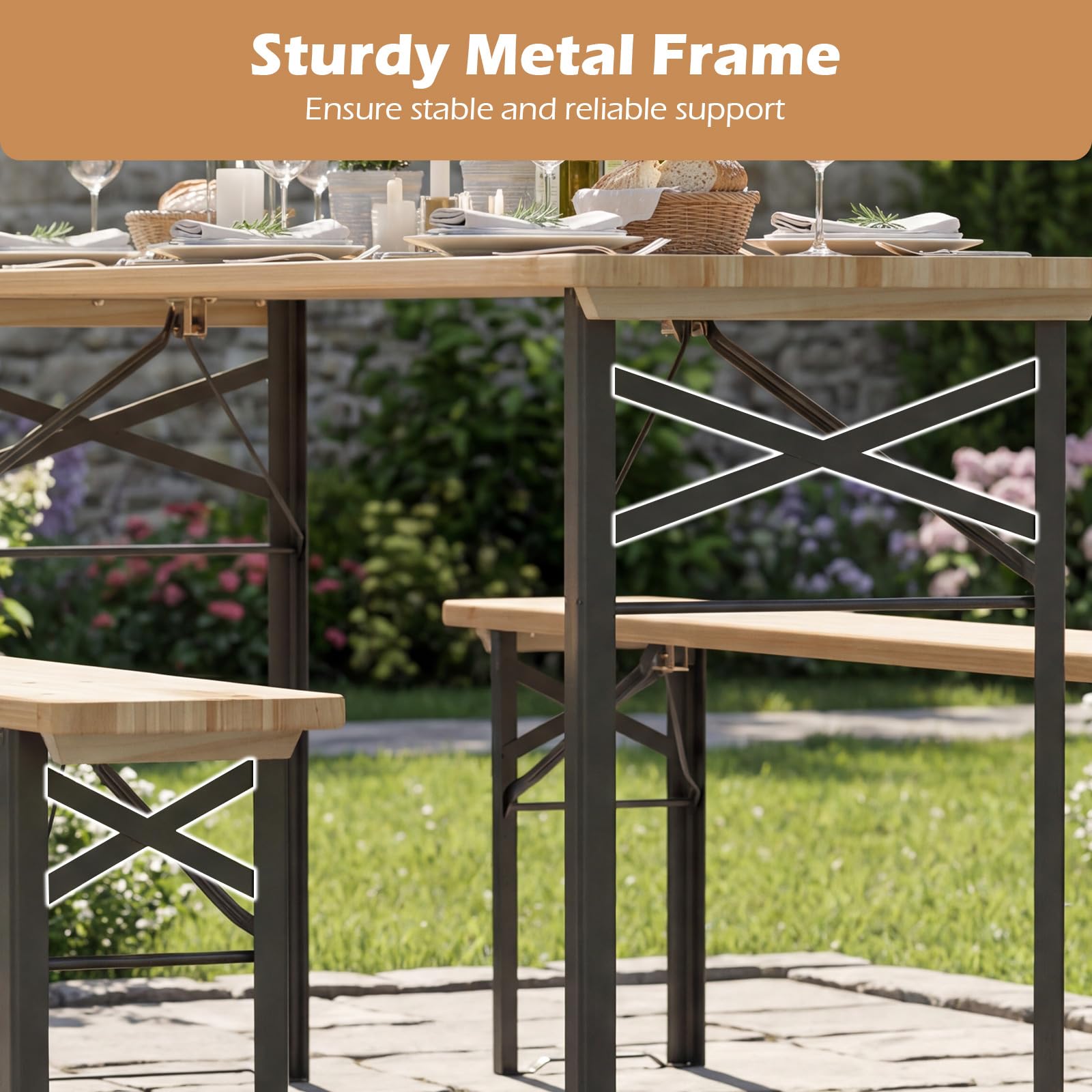 Elevate your outdoor gatherings with this versatile folding picnic table with benches.The sturdy metal frame provides consistent support and reliability, while the reinforced X-shaped structure ensures added stability for this outdoor dining furniture set. Crafted from solid fir wood, the splinter-free surface offers a smooth touch and easy cleaning, making the portable picnic table set both practical and safe. Each backless bench in this wooden bear table set seats 3 people comfortably. Designed with space-saving foldable functionality, this patio folding table with benches requires no assembly and is easy to fold or secure, making it perfect for your garden, patio or backyard BBQ gatherings.