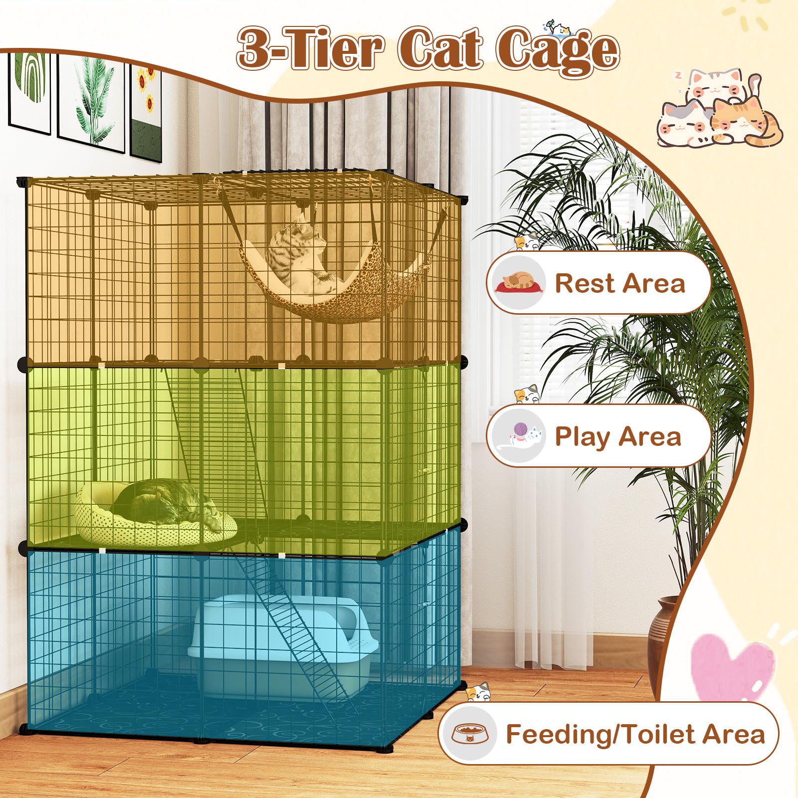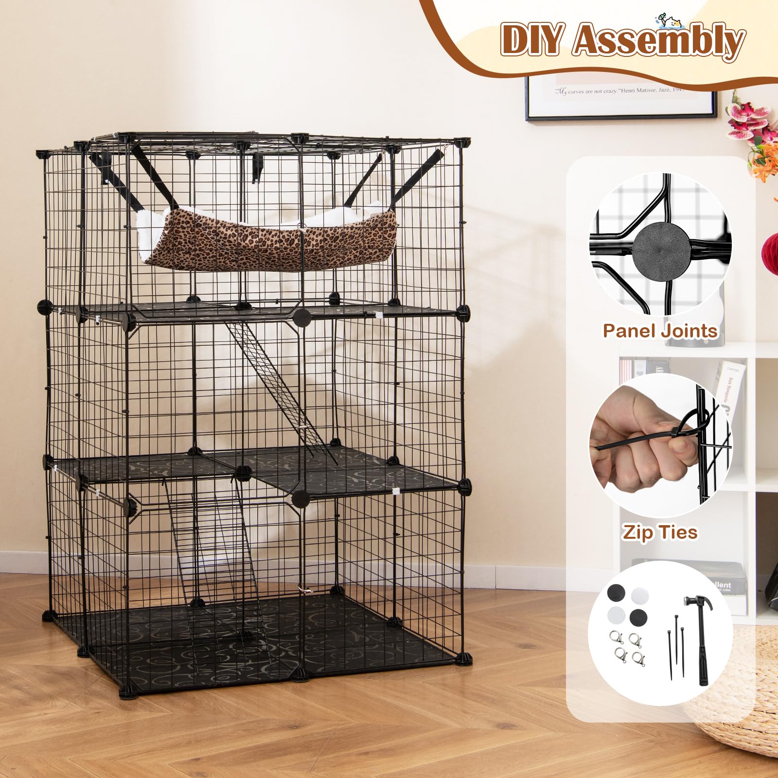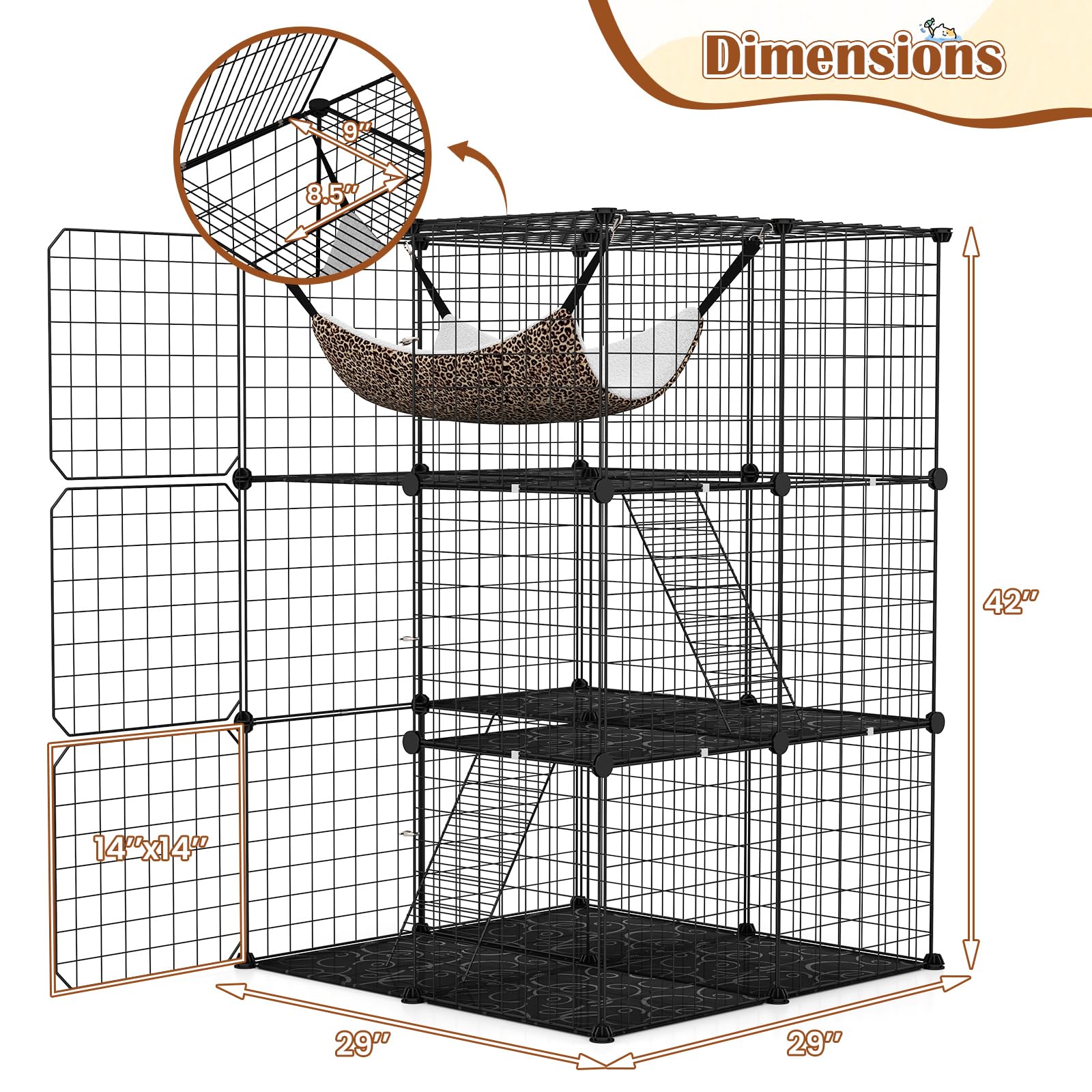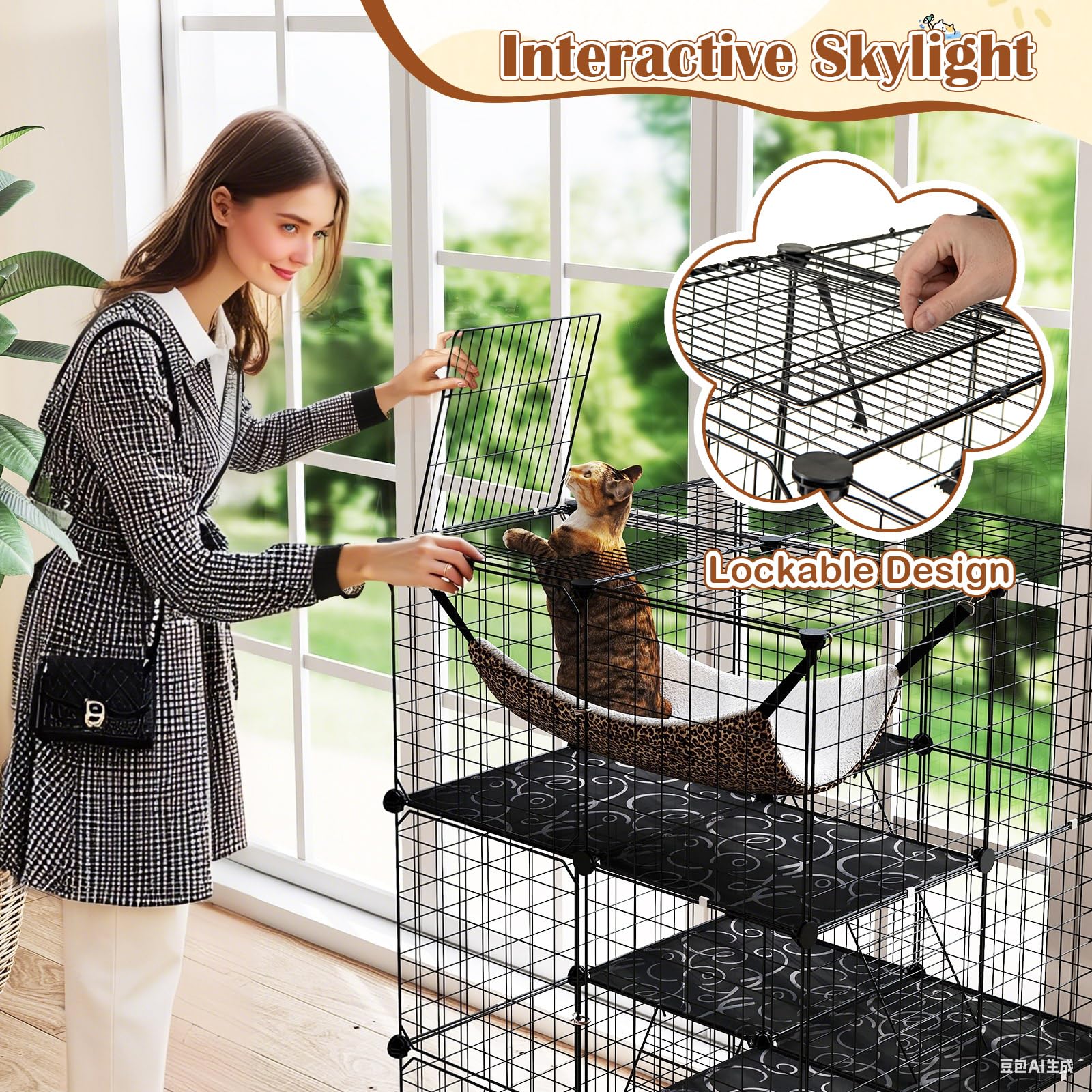 Give your cats a spacious and secure home with this 3-tier indoor cat cage, designed for 1-3 cats or small animals. Featuring an interactive skylight, cozy hammock, climbing ladders, and wide platforms, this cat playpen creates the ultimate play and rest area. The sturdy metal frame ensures stability, while the anti-tip kit adds extra stability. The 3 front doors with secure locks provide easy access, and the wire structure ensures optimal airflow. The detachable panels allow for customized layouts to fit different spaces. The detachable panels enable customized layouts to fit different spaces. This versatile DIY playpen provides a fun and safe environment for cats, kittens, rabbits, ferrets, chinchillas, and other small animals.