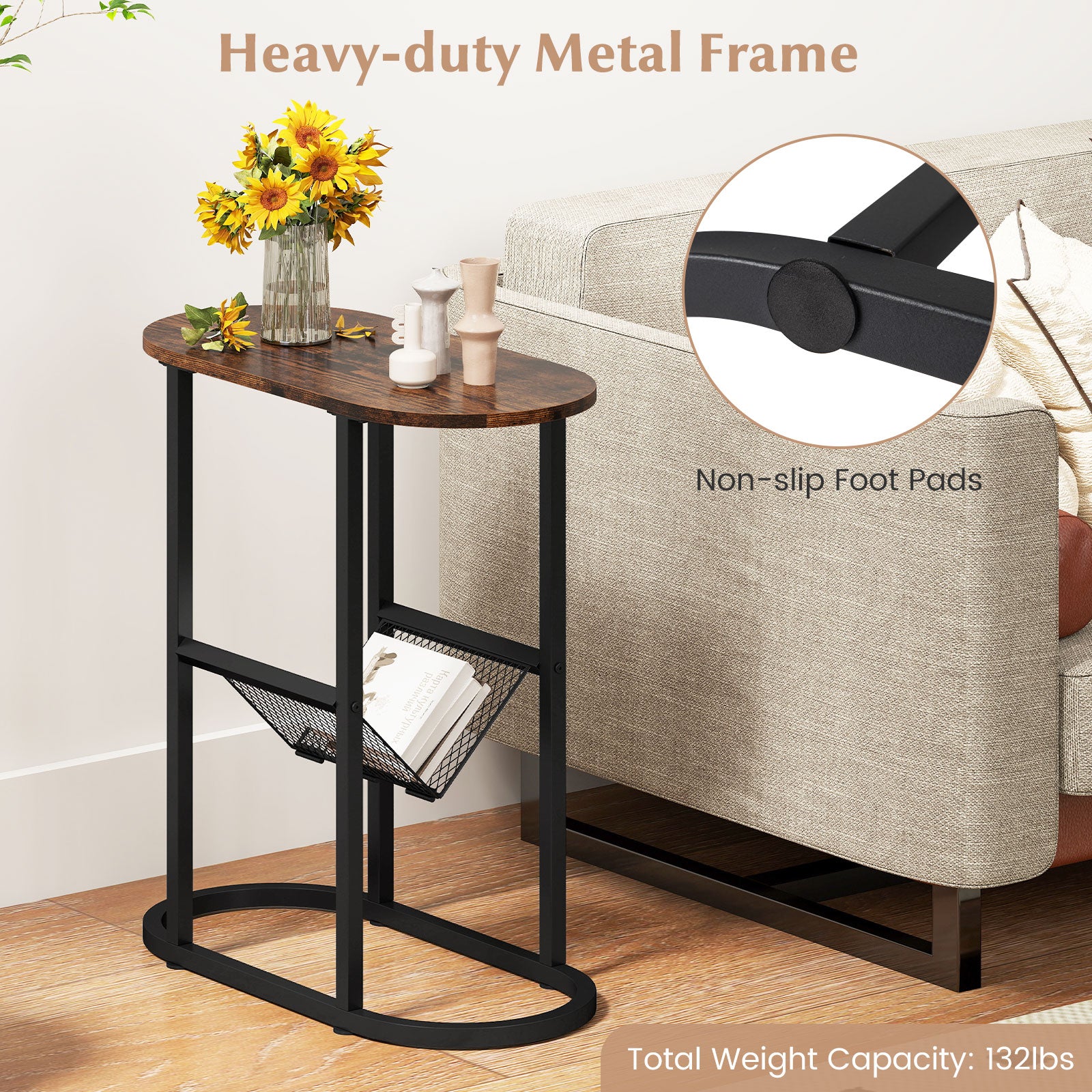 Discover the perfect space-efficient solution with our stylish, narrow side table. Perfect for tight spaces at 24” x 11” x 25”, it elegantly fits wherever you need it – next to your cozy sofa or as a charming nightstand. Say goodbye to bumps and scrapes with its rounded oval design. This isn’t just a table; it’s a statement piece with its V-shaped magazine rack and robust metal frame, designed to support up to 132 lbs and endure over time. The stylish finish injects a dose of sophisticated into any setting. Don’t let a cramped space cramp your style – elevate your home with this multi-functional, exquisite piece of furniture today!