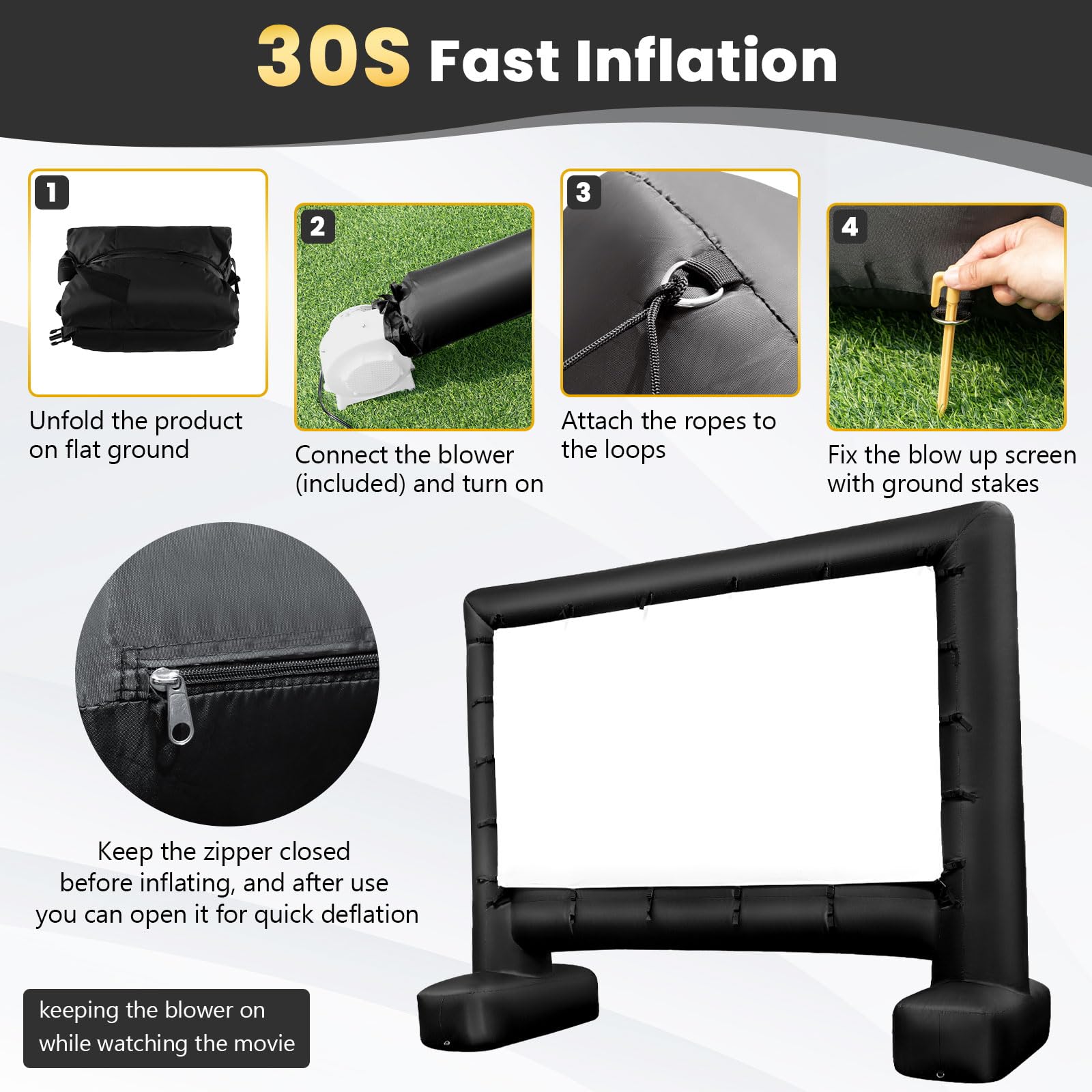 - Super Easy Setup with Blower: Equipped with a quiet electric blower, this movie screen can be inflated in 30S and keeps working throughout the show when plugged in. Ground stakes and ropes are included for stable and fast installation. You can also fold the projector screen and store it in the storage bag for easy carrying.