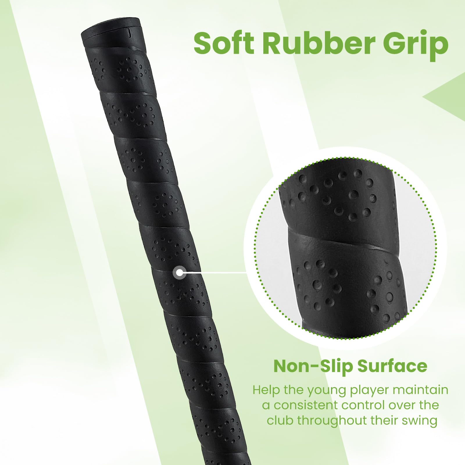 - Premium Fiberglass Shaft: Specifically engineered for young golfers, the fiberglass shaft ensures lightweight construction, high flexibility and launch angle, greater distance and accuracy and enhanced vibration dampening for less strain on hands and arms.
