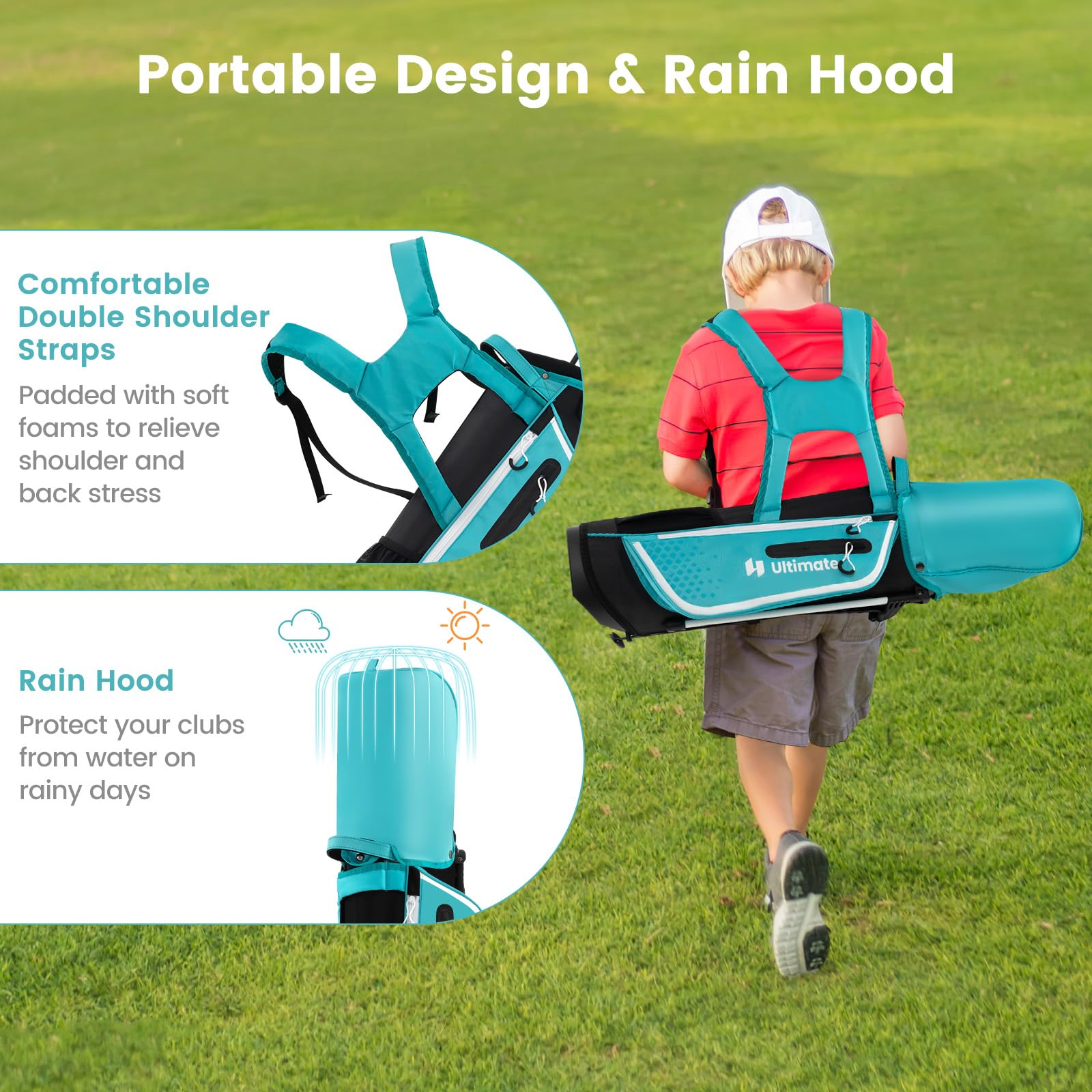 - Multifunctional Stand Bag: This multifunctional golf stand bag is tailored for junior players. Complete with comfortable double shoulder straps to alleviate stress, a stable triangular structure, rain hood, ample pockets, and a 4-way top organizer, ensuring easy access and protection for all golfing essentials.
