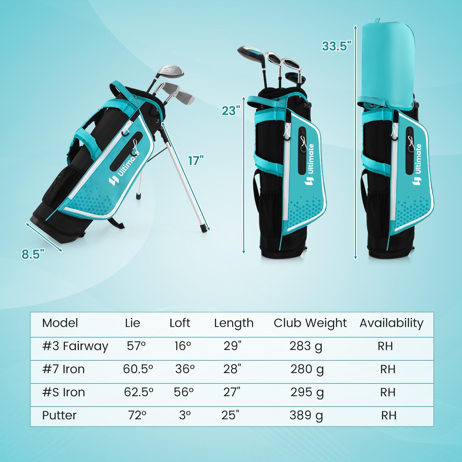 - Perfect Gift for Kids: Designed for kids aged 5-7, this complete golf set provides all the premium tools they need to excel: golf stand bag with rain hood, #3 fairway with head cover, #7 iron, #S iron and a putter. It surly can be a perfect gift to support their sporting dreams and create cherished memories on the fairways.