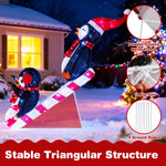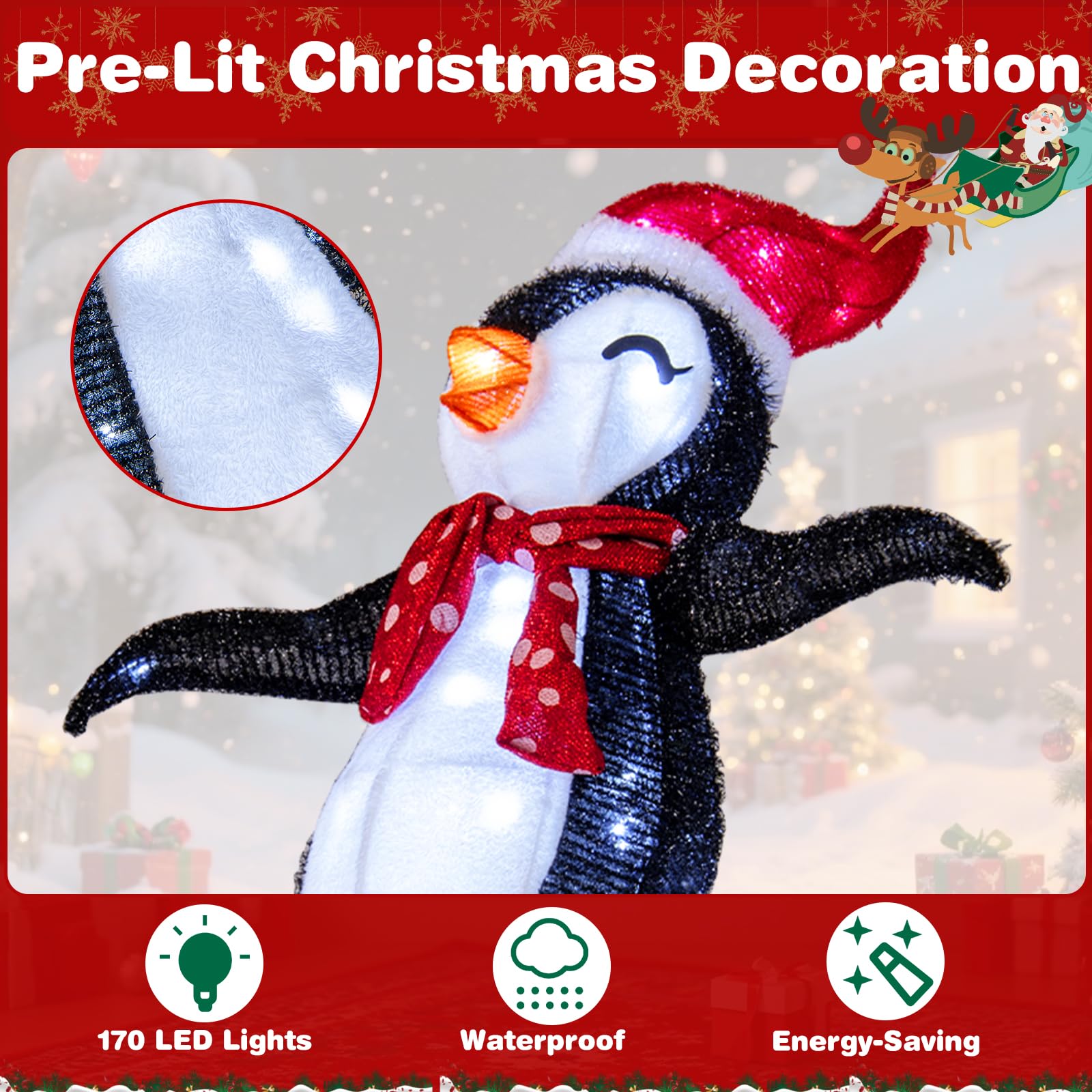 Illuminated by 170 LED lights, this pre-lit display casts a magical glow whether set up indoors or out. The robust fabric, and powder-coated metal frame ensure durability and seasonal beauty. Easy to assemble, it includes a UL-listed adapter, 12 zip ties, and 4 ground stakes for quick and stable setup, with a triangular base structure for added stability. Ideal for lawns, porches, patios, offices, or parties, this holiday decoration brings whimsical charm wherever it’s displayed.