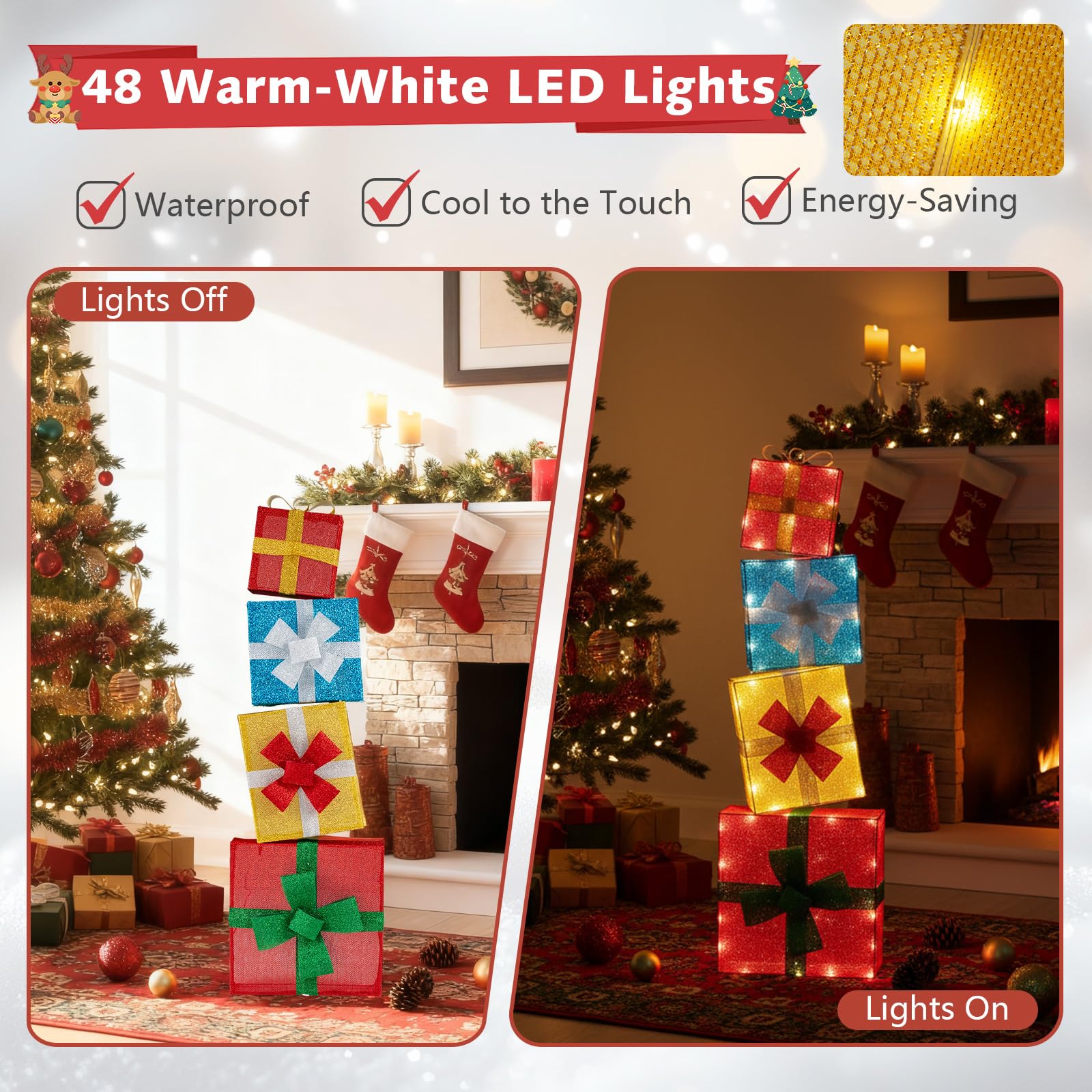 This Christmas lighted decoration is designed for creative versatility with both stacking and horizontal display options to suit any space or style. Each box is beautifully wrapped in glittering fabric and topped with a decorative bow. Equipped with warm-white LED lights, the boxes cast a cozy, inviting glow, perfect for welcoming family and guests. Simple setup is achieved with zip ties, and ground stakes. These gift boxes are ideal for porches, gardens, living rooms, or offices for a whimsical, radiant holiday accent.