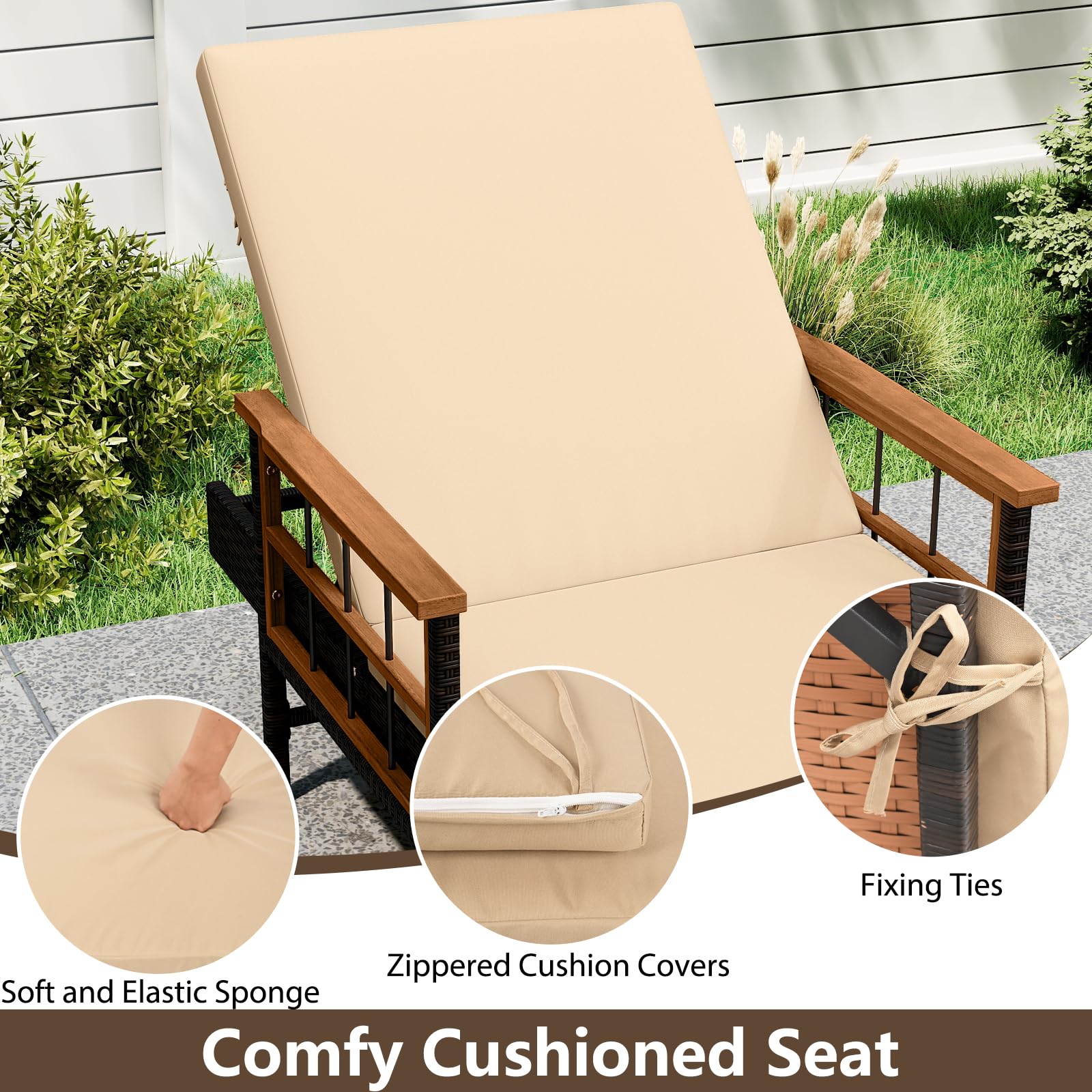 The 4-level adjustable backrest allows you to easily find the perfect angle for various activities such as chatting, reading, or sunbathing. Handwoven from sunproof mix brown PE rattan, the sun lounger offers both durability and charming aesthetic. The cozy cushions feature soft, elastic sponge with zippered, removable covers for effortless cleaning. Designed with a high-strength metal frame and non-slip foot pads, this patio wicker recliner supports up to 400 lbs while ensuring long-lasting stability. Discover unmatched comfort and elegant design in this premium outdoor reclining lounger.
