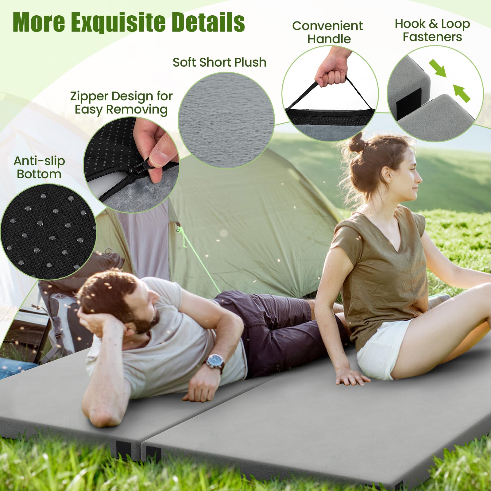 You'll finally get a good night's sleep in the wilderness with our comfortable memory foam pad. The extra thick sleeping pad is filled with soft memory foam and sturdy base support foam, providing amazing comfort for all types of sleepers. Waterproof plush surface keeps the mattress dry and usable in outdoor settings. Non-slip bottom also ensures that the pad won't move during use. As needed, the zippered cover can be removed for hassle-free cleaning. Thanks to the well-made details of hook and loop fasteners, you can connect it to another one and easily turn it into a larger bed! When not in use, the sleeping pad can be easily rolled up into the provided carry bag for your convenience on the go.