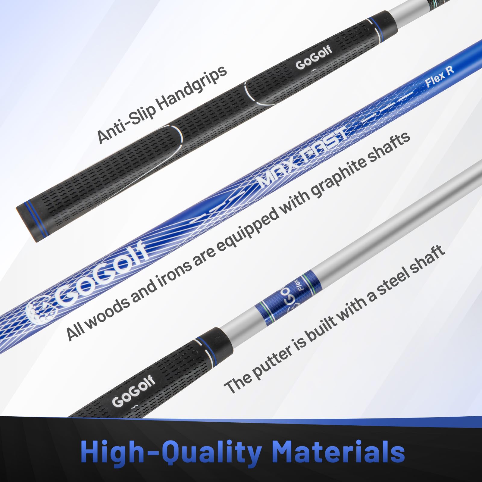 You will experience high-performance woods and irons with graphite shafts for optimal play. The irons' low center of gravity and cavity back design enhance stability and forgiveness, while the putter aids in precise putting. The lightweight and portable golf bag features ample storage, ensuring comfort and organization on the course.