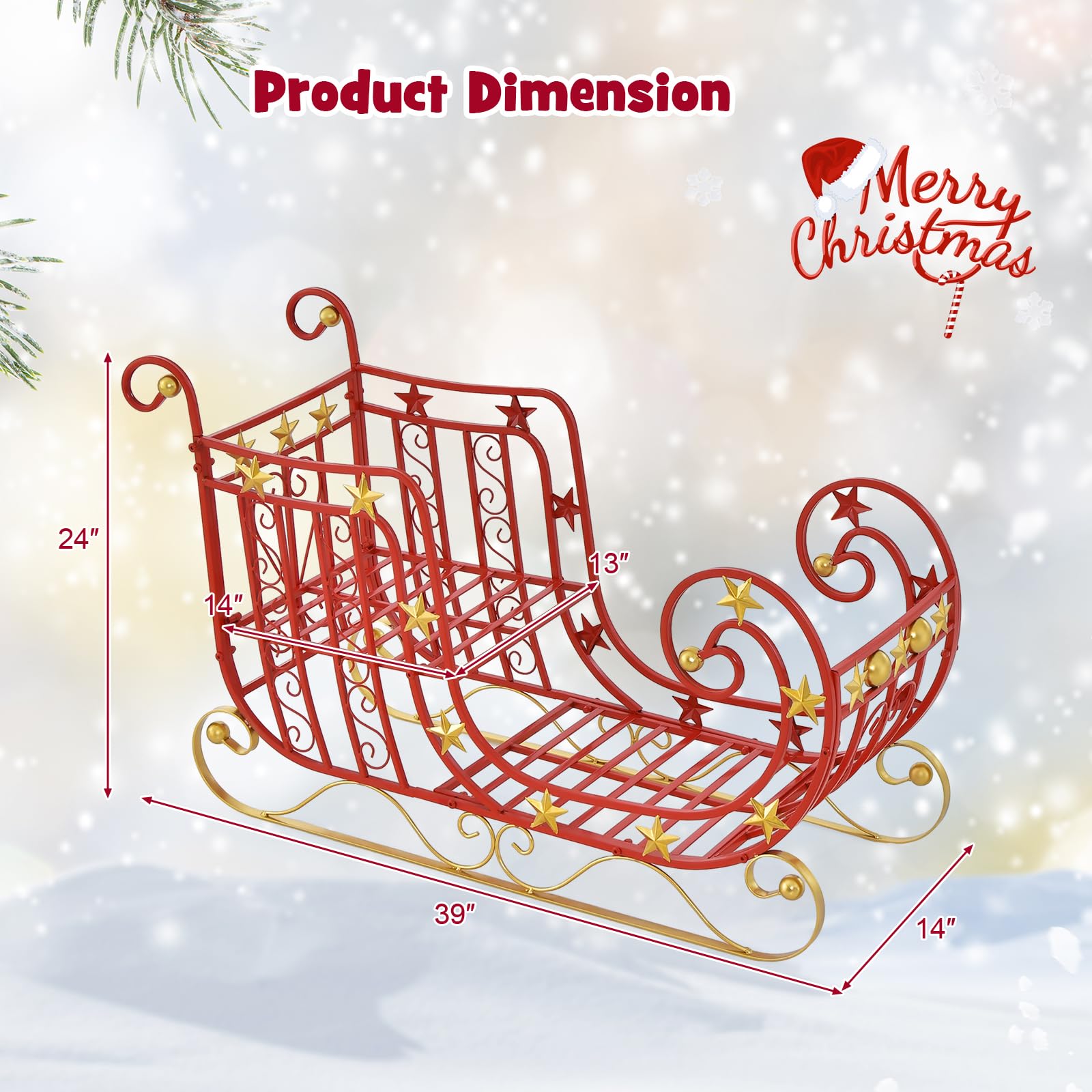 - Christmas Santa Sleigh Basket Decoration: Adorned with sparkling golden stars and intricate scrollwork ornamentation, this red Christmas Santa sleigh showcases a stunning appearance that elevates the festive atmosphere. With this piece, you can create cherished memories during the enchanting Christmas holiday, surrounded by your loved ones.