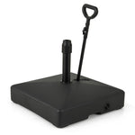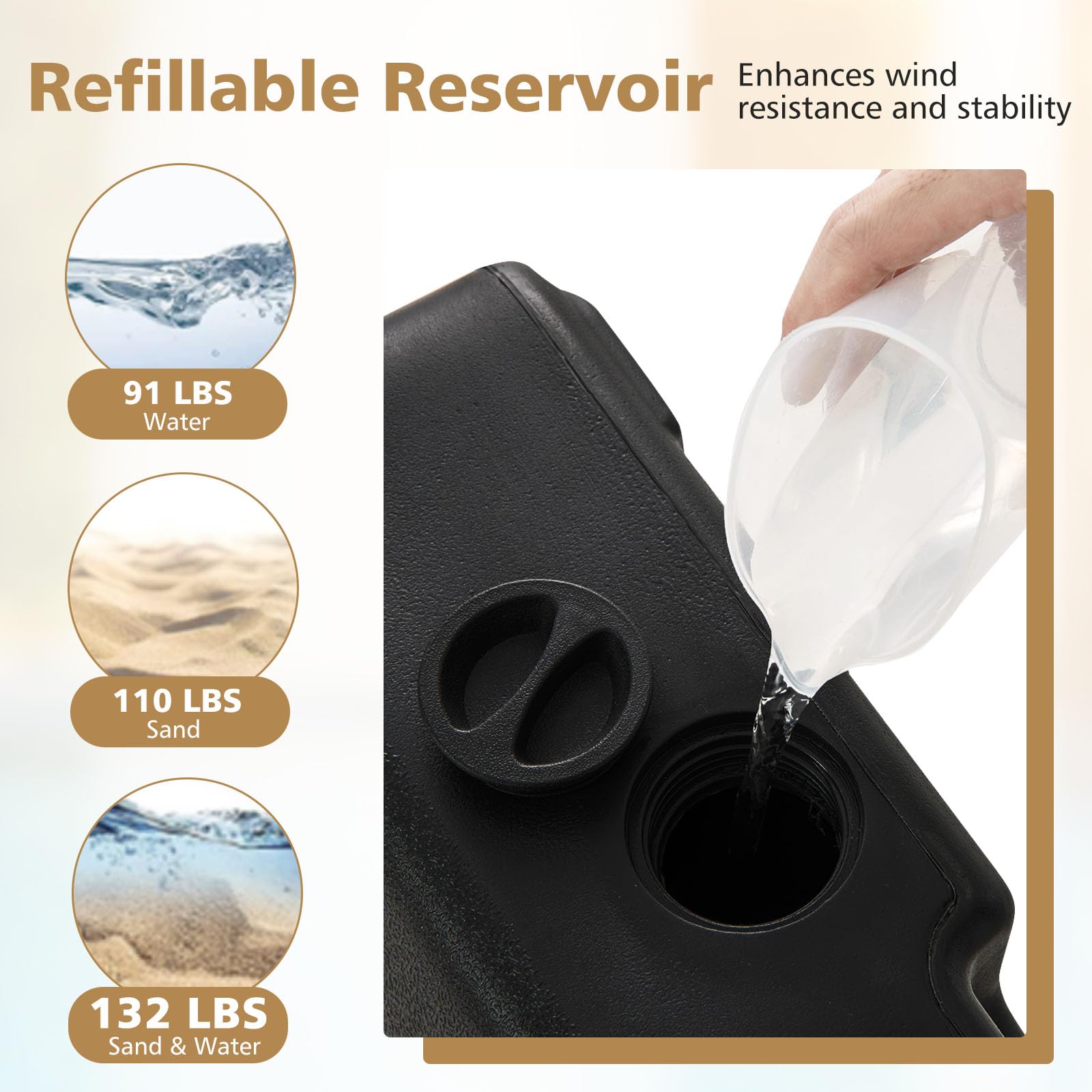 Our mobile patio umbrella base measures 24" x 24" x 28"-40"/60 x 60 x 70-100 cm (L x W x H) and features 3 adapters, which are compatible with patio umbrellas with 1.89"/1.5"/1.34", 48/38/34 mm pole diameters (Warm tips: Please check your umbrella size before purchase). In particular, our base includes rolling wheels and a retractable pull rod, allowing you to move and position your umbrella wherever you desire. Furthermore, thanks to its innovative locking system, it is easy to lock the base in place by conveniently lifting the rod. To keep your umbrella securely even in windy conditions, the base can be filled with 91 lbs/41 kg water, 110 lbs/50 kg sand, or 132 lbs/59 kg sand and water. Additionally, this umbrella stand, constructed from robust HDPE material, offers unparalleled durability and weather resistance, ensuring it remains vibrant and deformation-free over time. It is perfect for poolside lounging, backyard gatherings, or any outdoor event.