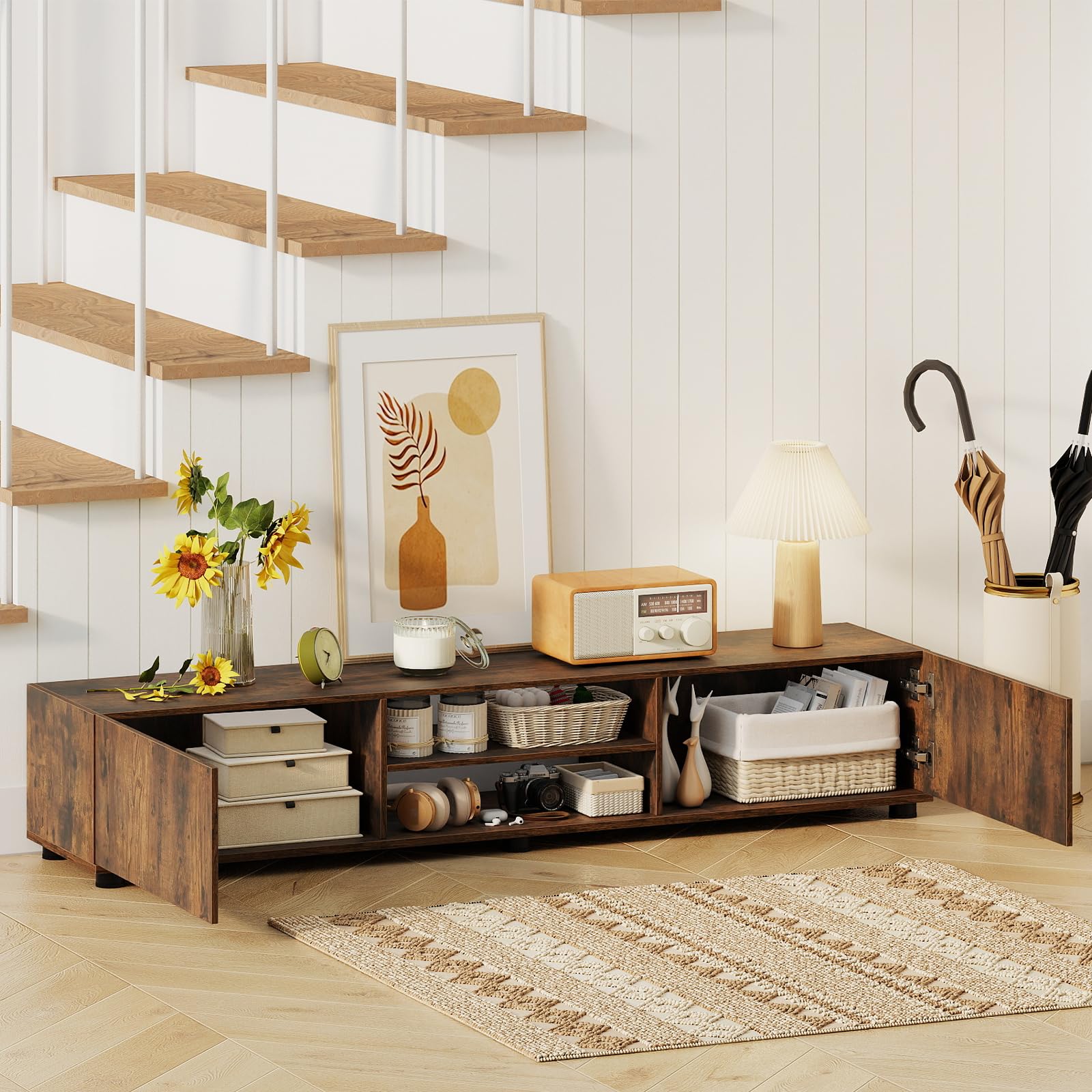 Discover the perfect blend of style and convenience with our sleek 63” TV stand—perfect for screens up to 70”. Not just a TV stand, it transforms into a chic console table in a snap. Its minimalist design with clean lines and a smooth finish effortlessly fits any furnishing style, adding a contemporary touch to your space. Keep your living area tidy with ample hidden storage for all your gadgets and essentials, while enjoying easy access whenever needed. Built with robust materials to last through endless binge-watching marathons and featuring whisper-quiet doors, this is the peace-of-mind addition your home deserves.