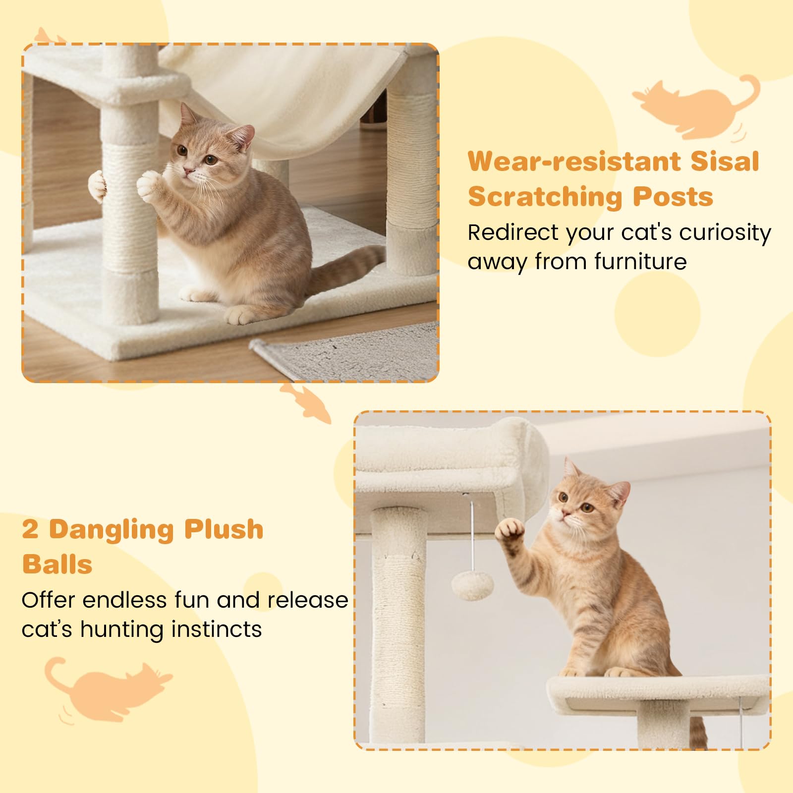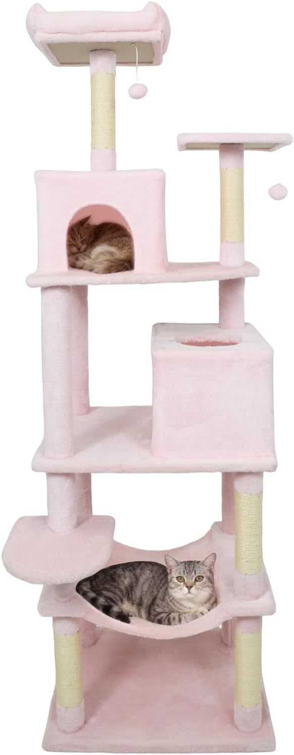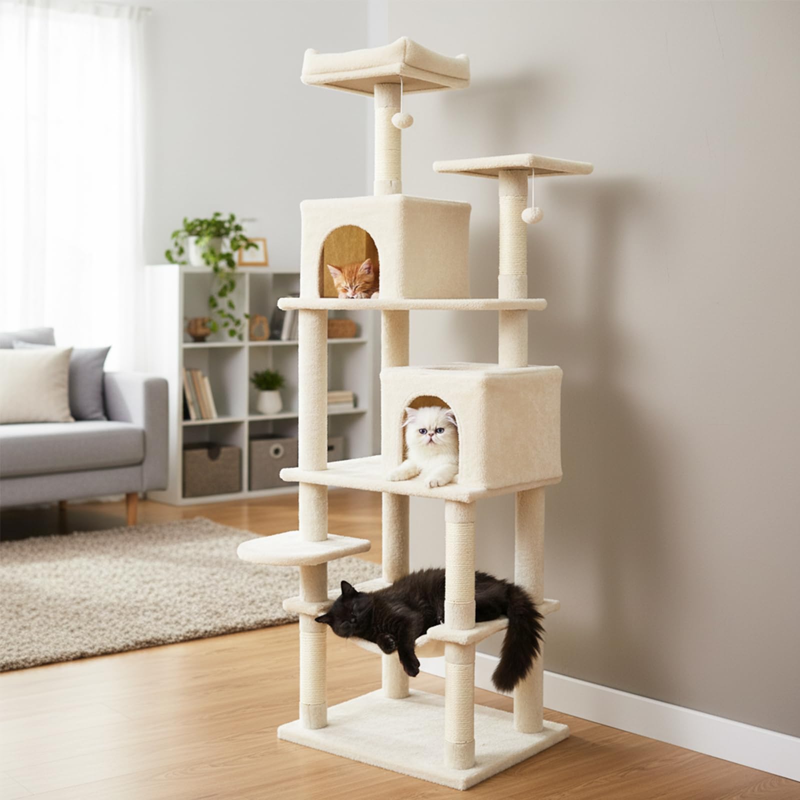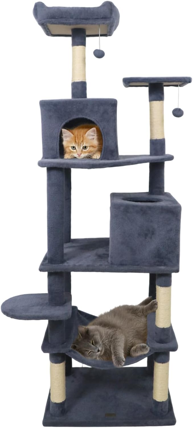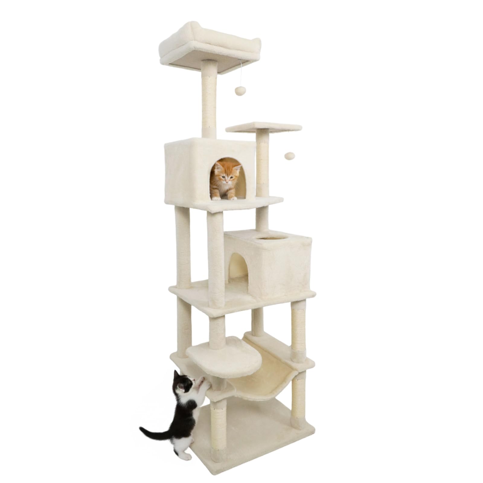 The multi-level cat tower is designed to provide endless entertainment and cozy retreats. A condo with large entry and a condo with skylight & entry offer different options for cats to hide and rest. Plus, a plush hammock allows felines to unwind in style. The spacious top perch gives your feline friends the perfect spot to observe their surroundings from above. In addition, sisal-wrapped scratching posts support healthy claw habits and help keep furniture safe from scratches. For playful moments, 2 dangling plush balls entice energetic leaps, satisfying their natural hunting instincts. Also, the cat tree’s extra wide base ensures reliable stability, while the included anti-tipping kit delivers added peace of mind. Soft, plush fabric envelops the entire structure, creating an inviting environment that your cats will love to explore day after day.