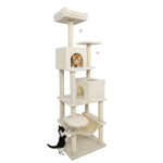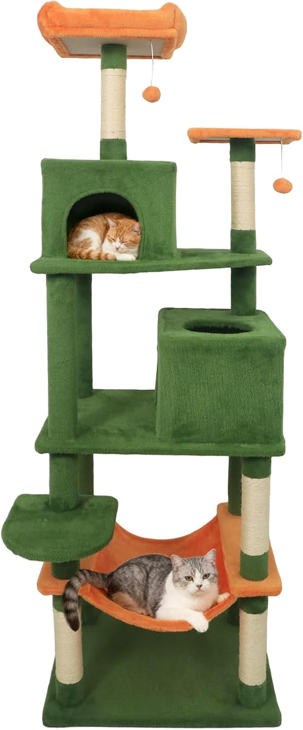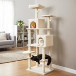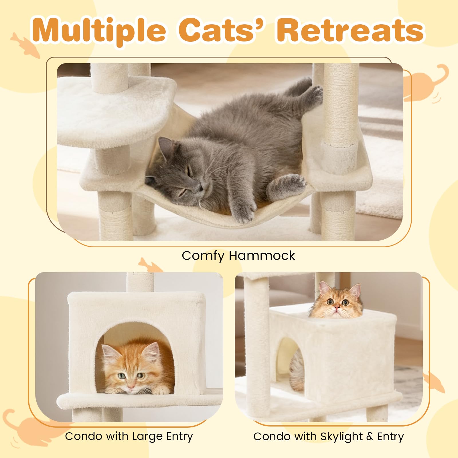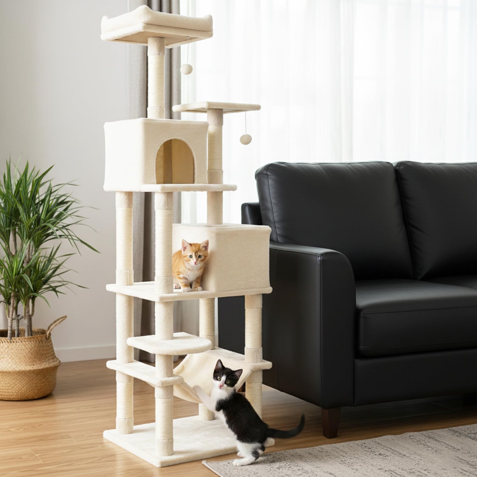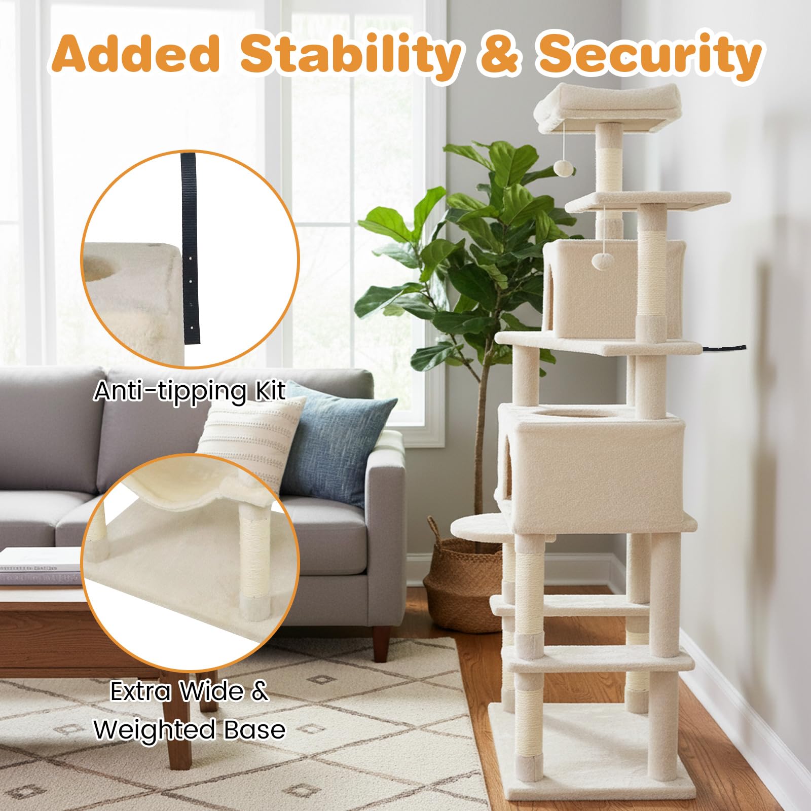 The multi-level cat tower is designed to provide endless entertainment and cozy retreats. A condo with large entry and a condo with skylight & entry offer different options for cats to hide and rest. Plus, a plush hammock allows felines to unwind in style. The spacious top perch gives your feline friends the perfect spot to observe their surroundings from above. In addition, sisal-wrapped scratching posts support healthy claw habits and help keep furniture safe from scratches. For playful moments, 2 dangling plush balls entice energetic leaps, satisfying their natural hunting instincts. Also, the cat tree’s extra wide base ensures reliable stability, while the included anti-tipping kit delivers added peace of mind. Soft, plush fabric envelops the entire structure, creating an inviting environment that your cats will love to explore day after day.